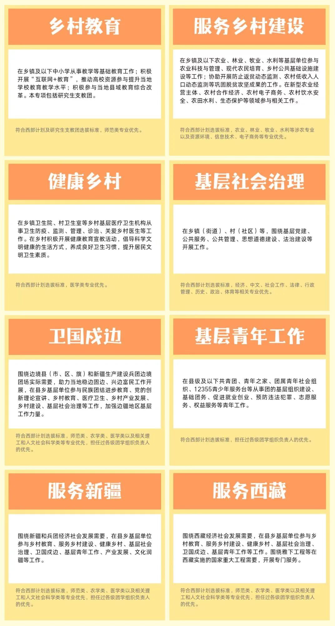 乡村教育、服务乡村建设健康乡村、基层社会治理卫国戍边、基层青年工作服务新疆、服务西藏