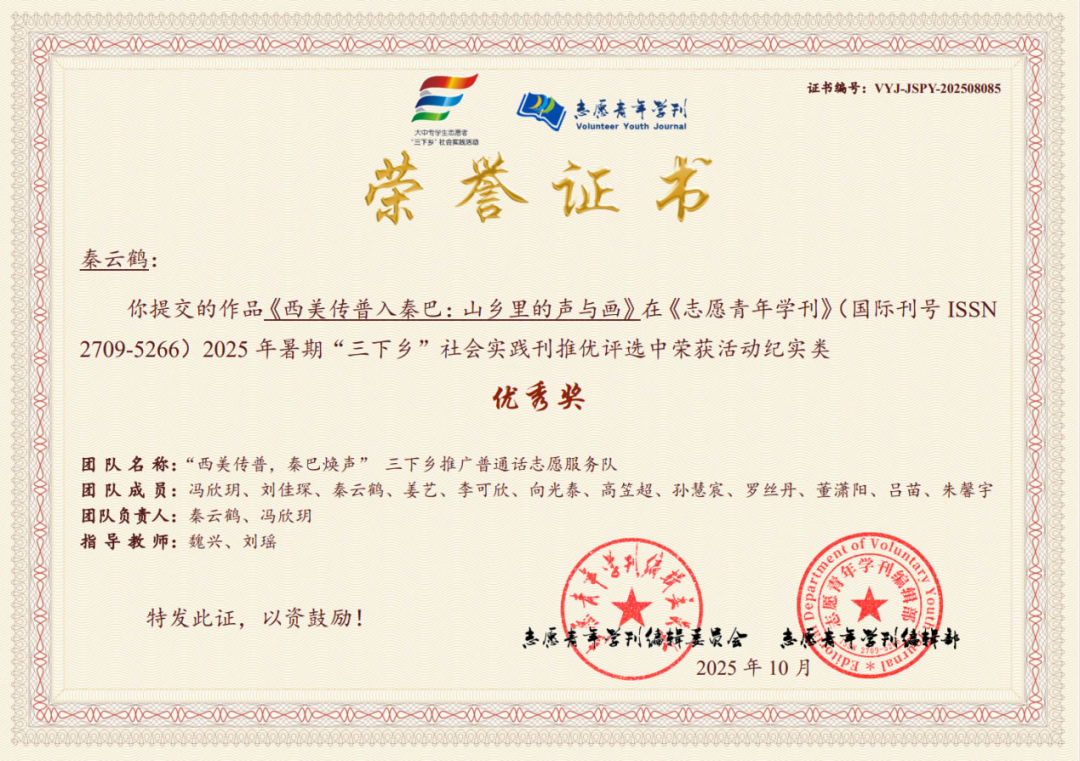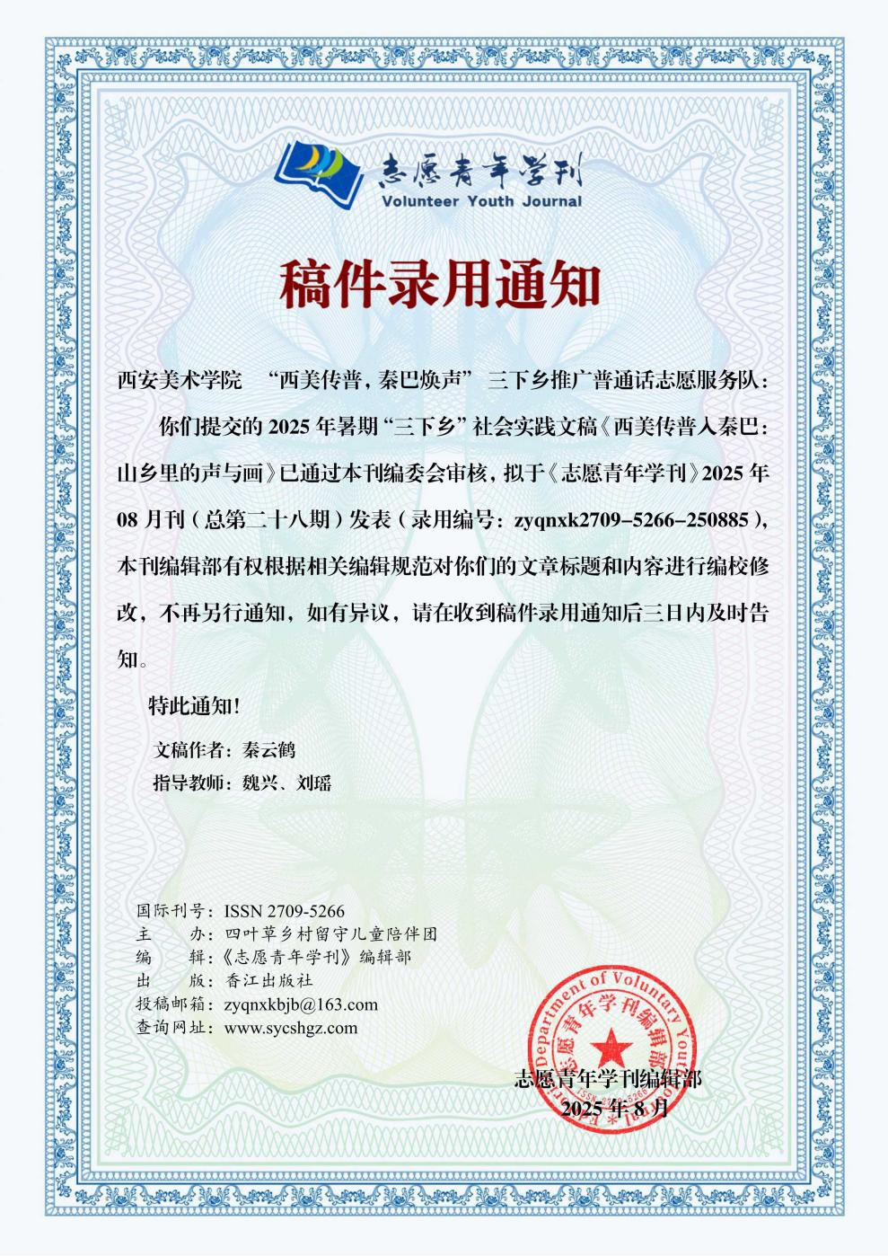 近日,《志愿青年学刊》(国际刊号ISSN2709-5266)编辑部发布录刊结果,西安美院“西美传普,秦巴焕声”三下乡推广普通话志愿服务队秦云鹤提交的《西美传普入秦巴:山乡里的声与画》被杂志收录。同时,在《志愿青年学刊》社会实践刊活动纪实类推优评选中《西美传普入秦巴:山乡里的声与画》荣获活动纪实类优秀奖,魏兴、刘瑶获优秀指导教师。