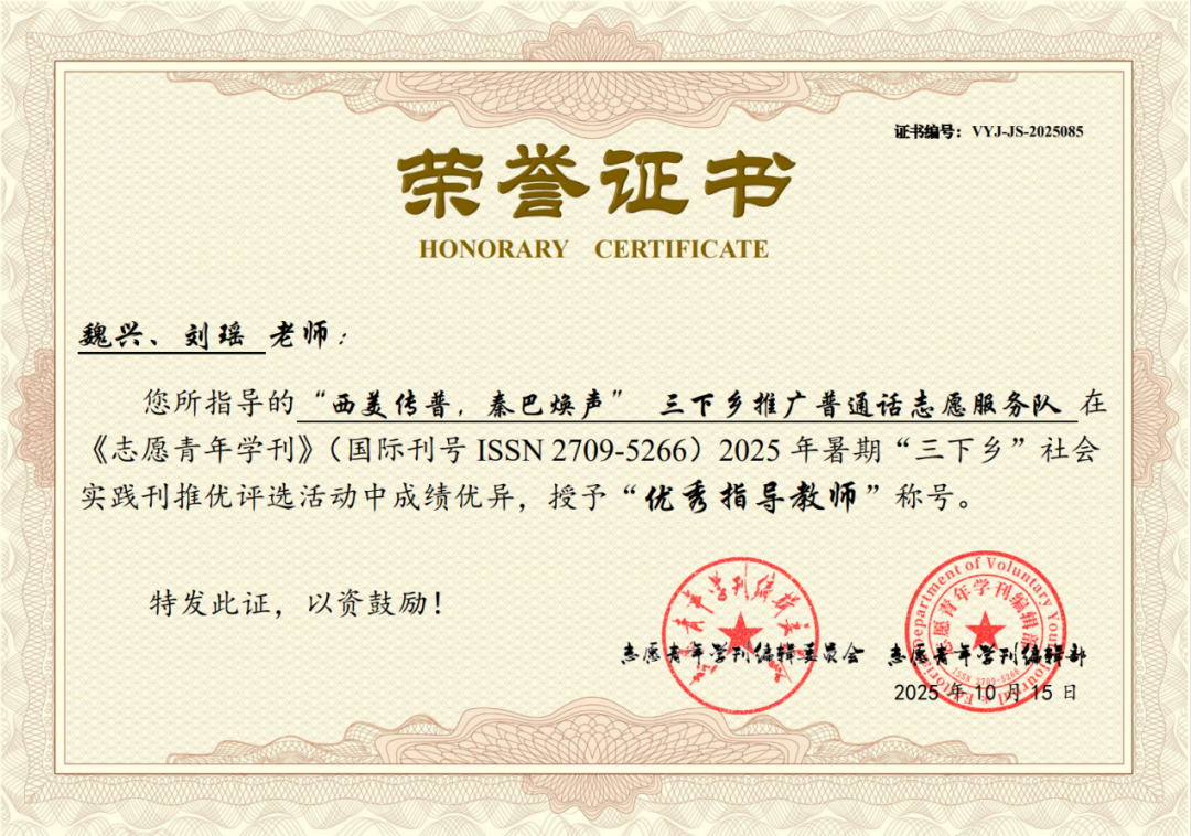 “西美传普,秦巴焕声”三下乡推广普通话志愿服务队,由段慧杰、魏兴、刘瑶、付伟巍指导,入选2025年教育部推普助力团队和团中央“两弹一星”宣讲团。7月7日至16日,团队赴镇安县、镇巴县开展美育课程、推普等活动,团队创新“美育+”模式,设计推普手册,开展美育课堂30余次,覆盖学生800余人次;构建“艺术+文化+产业”模式,打造了7款农产品包装,举办了2场妇女手工艺培训班,培训100余人次;举办作品展、文艺汇演等,线上直播超3000人次。团队获人民网、中青网、中国网等30余篇国家级、省级媒体报道,阅读量超30万次。团队收到镇安县永乐街道中合村村委会、镇巴县鹿子坝社区居民委员会感谢信。