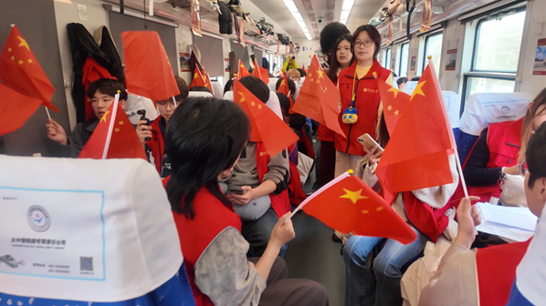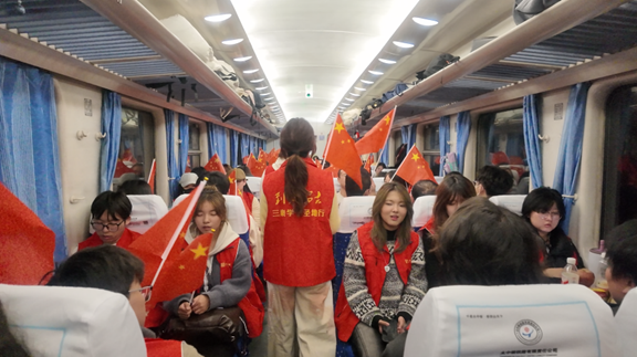 列车飞驰,歌声嘹亮。"五星红旗迎风飘扬,胜利歌声多么响亮......"激昂的旋律在车厢内回荡。学子们自发组织起红歌传唱,从《歌唱祖国》到《我和我的祖国》,每一句歌词都饱含着对中国共产党的深情,每一个音符都跳动着青春的脉搏。"让艺术的旋律与红色的基因,在奔赴圣地的路途上先期交融。"歌声穿越黄土高原,将青春的激情洒向这片红色的土地。
