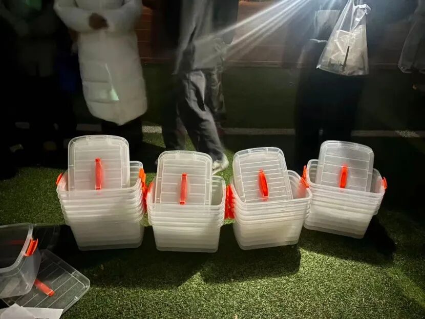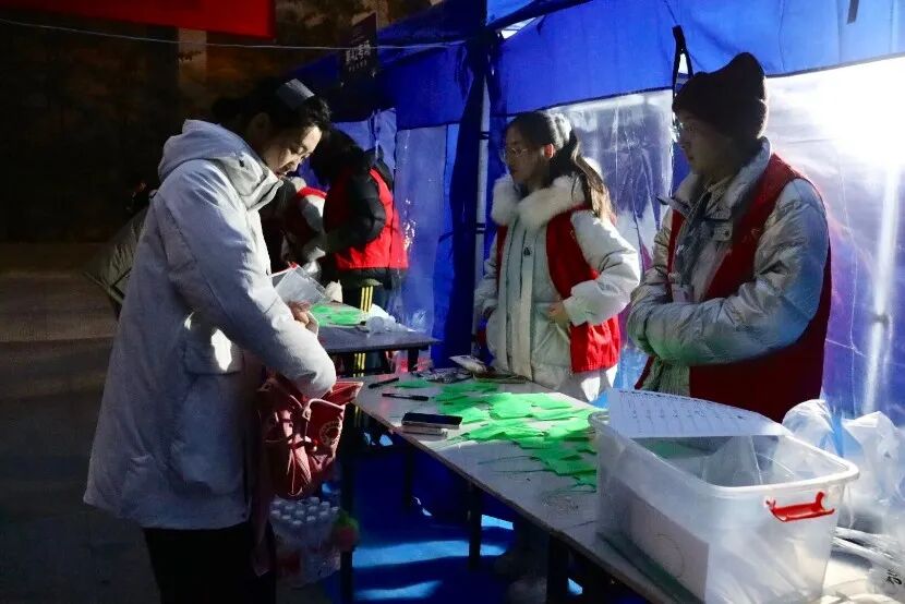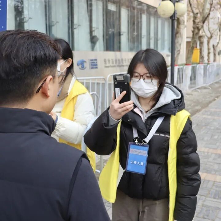 他们分工明确、热情周到,有的高效搬运分发考务物资,有的耐心为考生指引考场路线,有的细致维护候考秩序。风雨操场与学校小树林两处“考生存包处”同步高效运转,志愿者细致协助考生安放个人物品,让考生轻装上阵;安检通道前,志愿者柔声引导考生完成违禁物品检查、人脸与身份核验等环节,确保入场流程顺畅有序,“红马甲”的身影成为凛冬校园里最温暖的风景线。