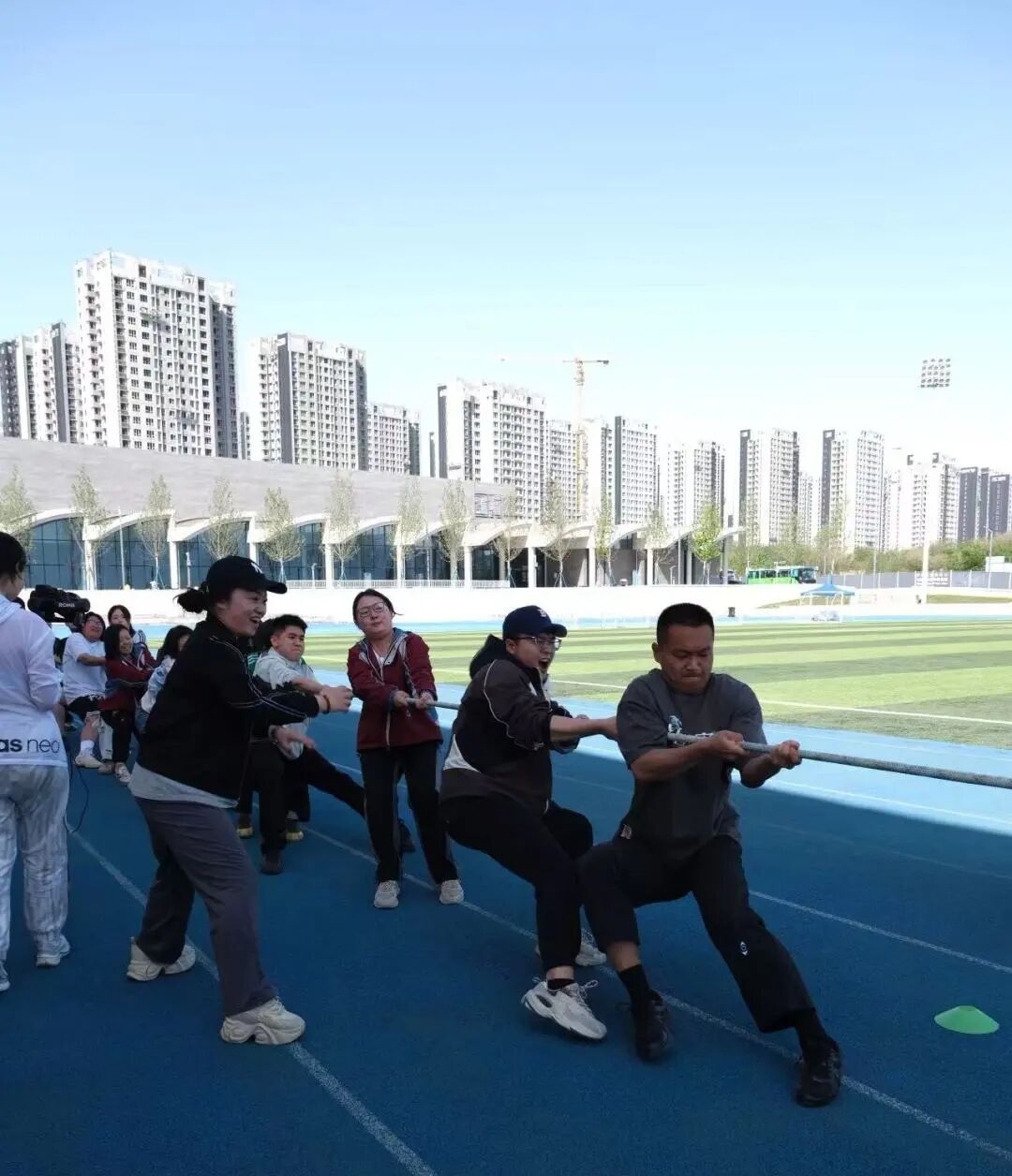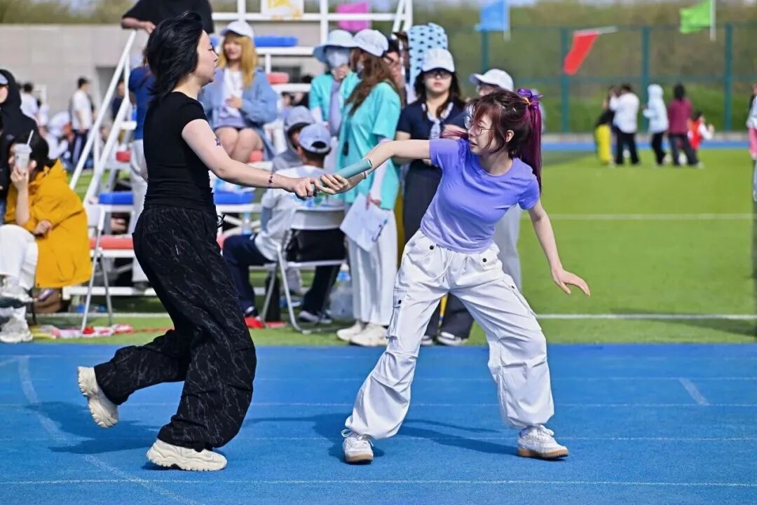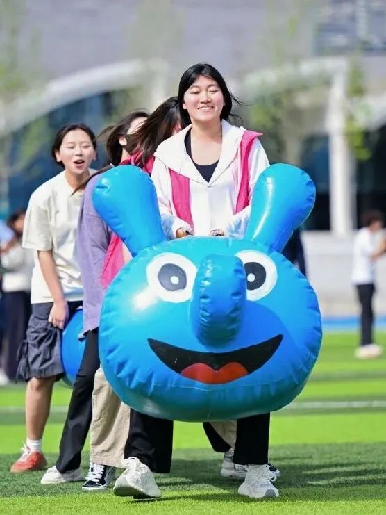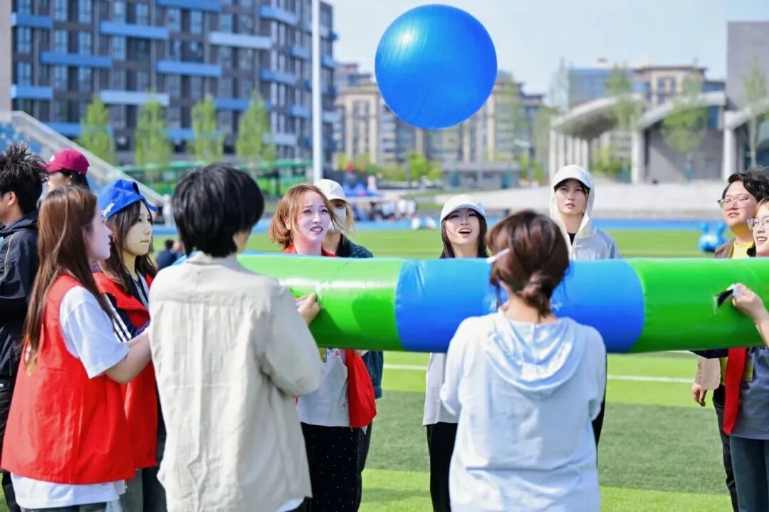 当比赛进入团体项目,气氛被推向顶点。“袋鼠跳”接力中,各院系化身跃动的音符,在绿茵场上奏响欢快的乐章;“毛毛虫”大赛里,师生们步调一致,在跌跌撞撞中“笑料百出”却又温情满满。而在“众星捧月”项目中,师生并肩作战,用默契诠释了“同心同向”的凝聚力。