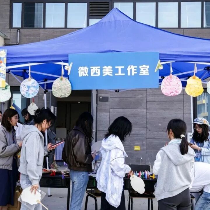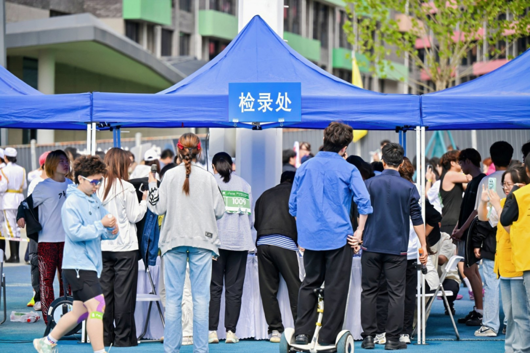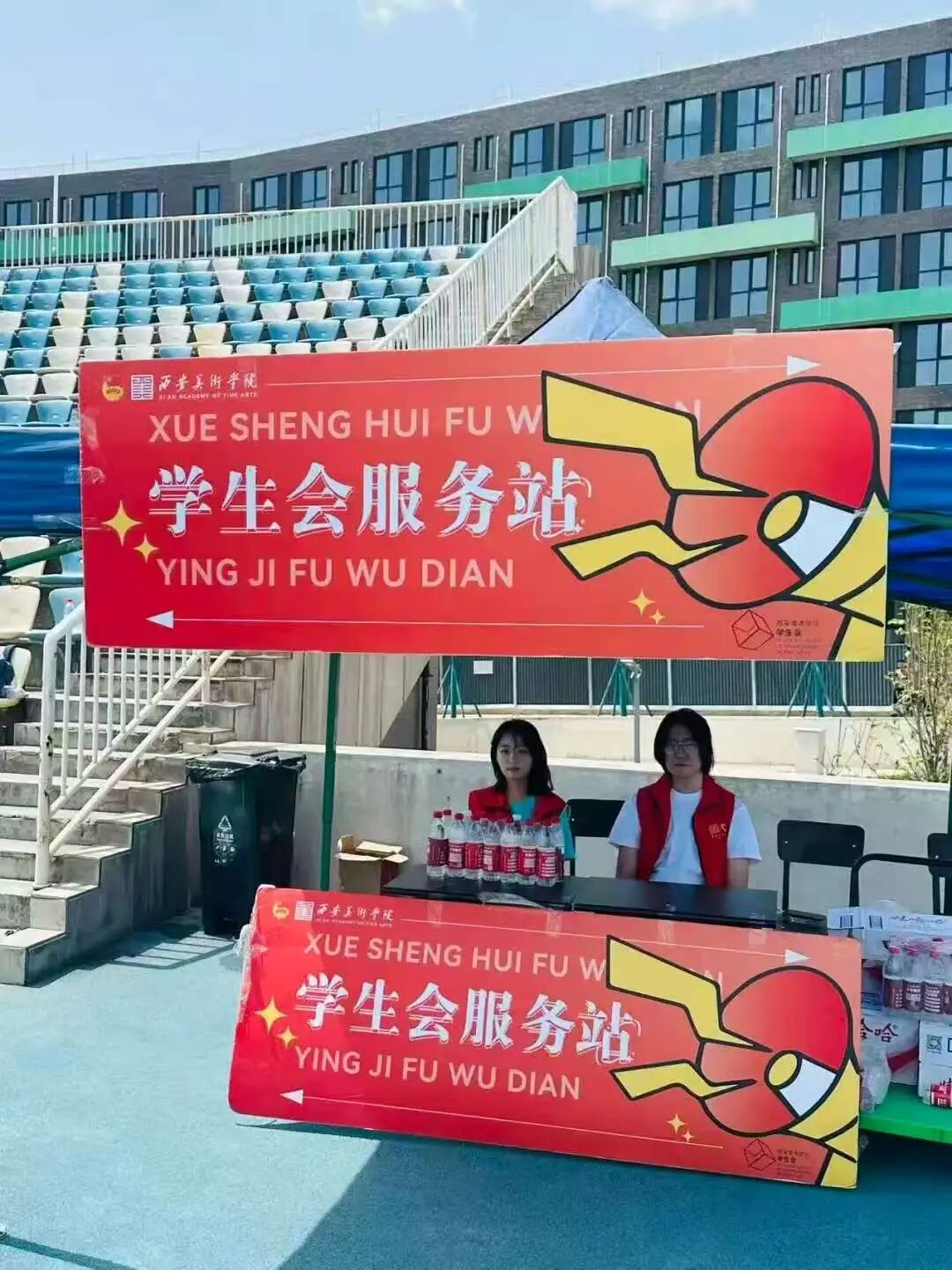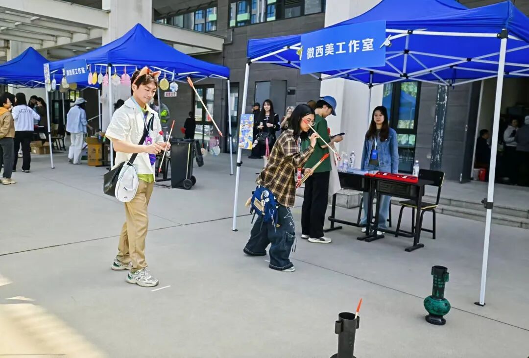 在赛场之外的下沉阶梯平台,师生们围坐于漆扇制作台前,或大漆漂流,或精细描绘,一件件独一无二的艺术品在指尖诞生。不远处的投壶游戏区笑声不断,赢取西美限定周边的小战场,成了紧张赛事中最轻松的调味剂;检录处旁边的学生会服务站,志愿者们或递饮水,或指引方位,还备有葡萄糖口服液、冰凉贴等用品,成了热血赛场里最清爽的补给站。