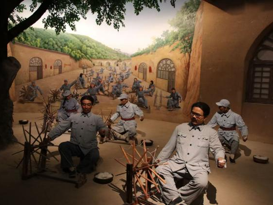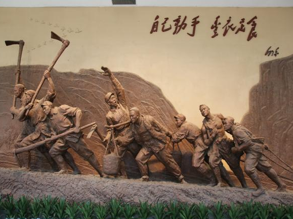 下午师生一行步入南泥湾大生产纪念馆,首先映入眼帘的是一座巨大的组群雕塑,遒劲有力的展现了南泥湾劳动军民栩栩如生的形象:有的弯腰挥锄,有的手指捻线,有的肩扛粮袋,他们的姿态没有丝毫懈怠,每一块肌肉的线条都蕴含着“自己动手,丰衣足食”的坚韧力量。