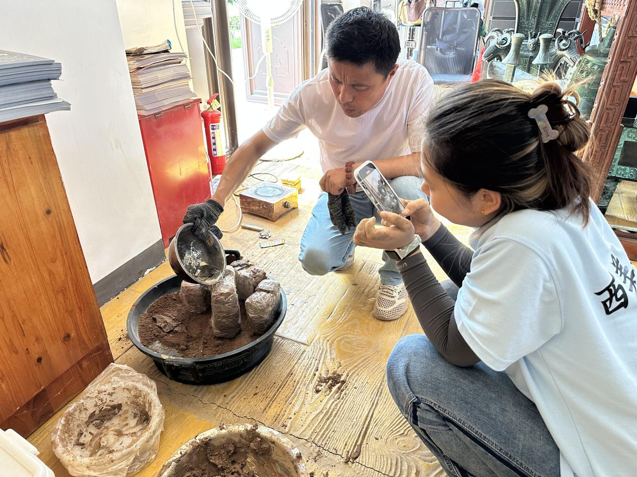 7月9日,是此次社会实践服务队的最后一天行程。清晨,同学们早早整装,赶往岐山县太平寺塔下的传统金工传习所,准备开始期待已久的金属铸造环节。而于安君先生比大家更早一步,已将各组的石膏模具整齐地放入烤箱进行二次烘干加固,为当天的实践工作做好充分准备。为了防止模具在高温金属浇铸时因残余水汽而产生爆裂,于总在模具内芯均匀喷涂了一层防护油漆。待所有模具充分干燥后,于总带领同学们进行模具合模操作,先将石膏阴阳模精准合拢,再用宽胶带一圈圈缠紧,随后用湿泥条层层包裹,仅在顶端留出进料的水口位置。这种“胶带+泥巴”的加固方式,是传统经验与当代材料的结合,可有效预防因浇铸时模具胀裂而导致的失败。