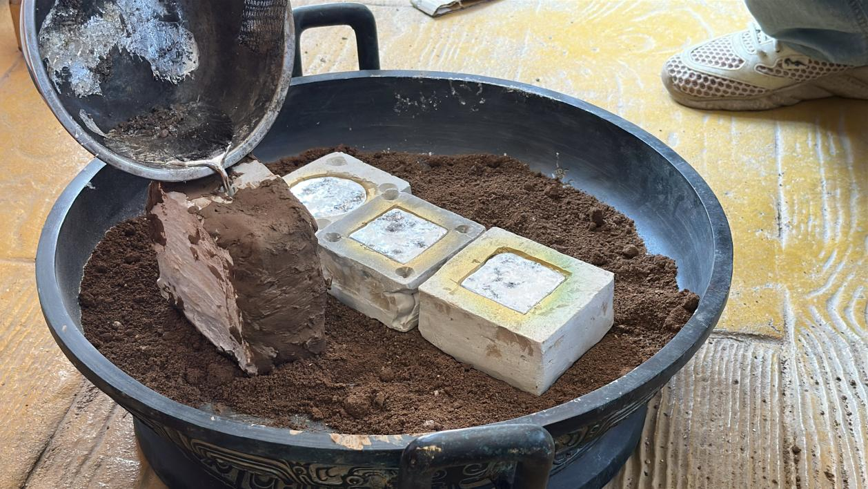 当银白色合金在电炉锅中缓缓融化,液态金属映照出炉火与目光交汇的光芒,于总小心地将其倒入一具具加固完毕的石膏模中——热流倾注,沉入模腔,似将一份份年轻的热情与敬意一同注入其中。尽管大家事前已将模具尽可能固定牢靠,但仍有个别模具在高温冲击下稍有松动,导致初次铸造未能完全成型。但实践本身就是一场反复打磨的过程,同学们冷静调整、重新加固、二次浇铸,最终皆收获了完整且饱含个人心力的金属作品。