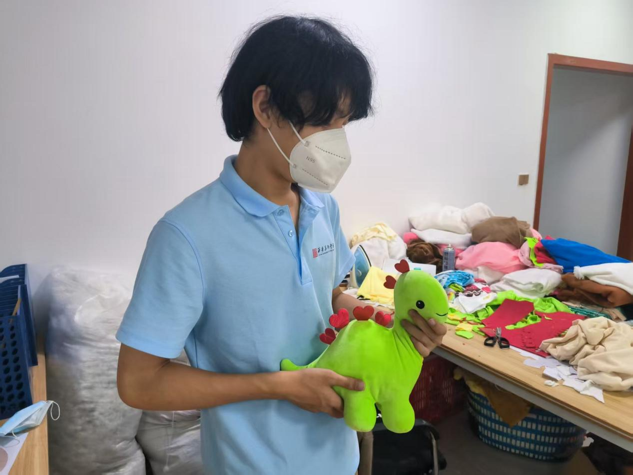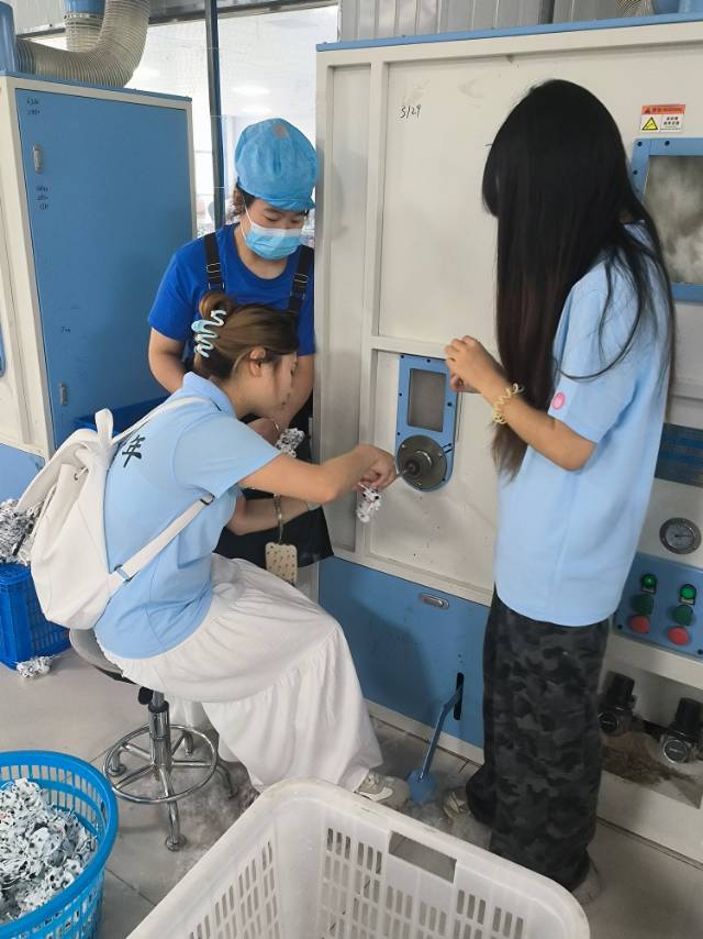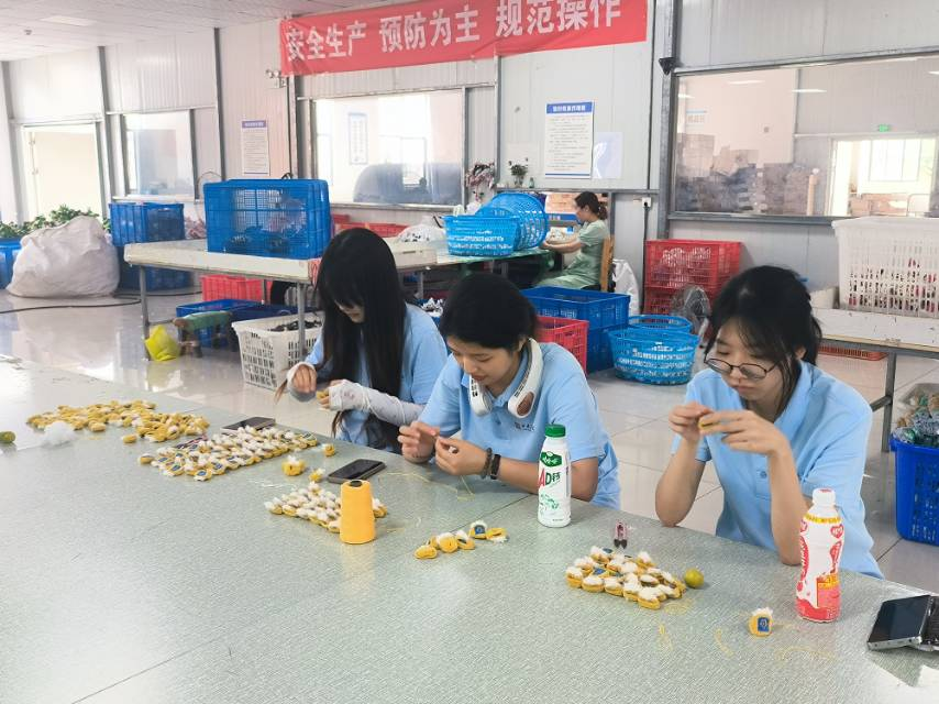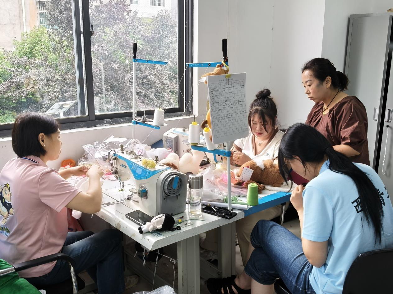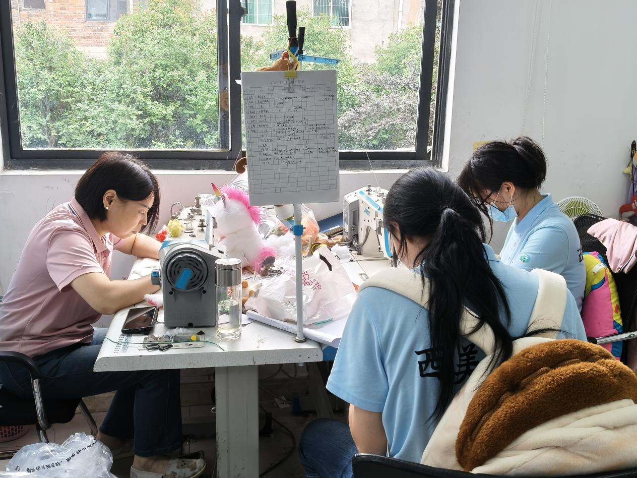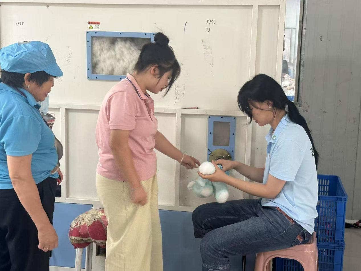 操作中,队员们遭遇布料“较劲”、玩偶变“圆气球”等状况,在师傅指导和互助下,逐渐领悟简单玩偶背后所需的“稳、准、恰到好处”。据最终统计共翻包270余个,充棉三件,缝针收尾192个。车间里,不同年龄段的工人各司其职,以专注态度确保每件玩偶品质。
