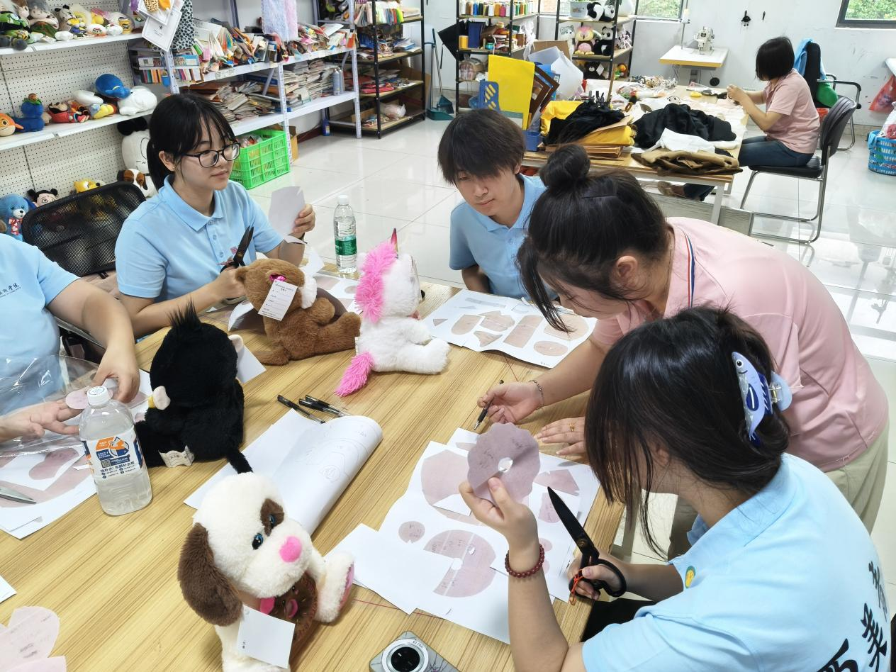 在爱多宝公司的生产车间,实践队员分组深入不同工序,亲身体验毛绒玩偶从设计图稿到立体成品的制造全过程。