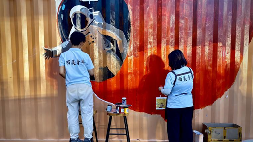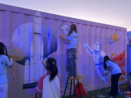 晨曦初绽,金色的光芒如碎汞般倾泻在科技馆的墙面上,为这场以航天为魂的创作镀上了一层神圣的光晕。实践队的队员们早已整装待发,在组长钱晞冉的带领下,于两个集装箱构筑的画布上悄然开启了笔墨征程。他们手持画笔,如执刻刀的匠人般专注,一笔笔为画面铺陈底色,每一次落笔都似在为星辰大海的蓝图打下坚实基石,那沉稳的笔触里,藏着对航天先辈的无限敬仰,更在为航天精神的视觉史诗筑牢根基。