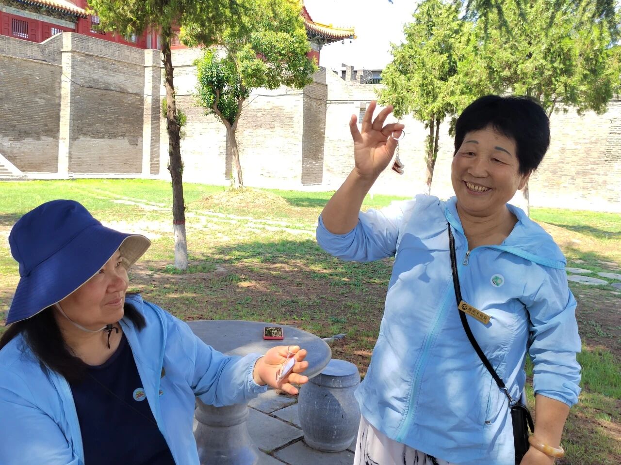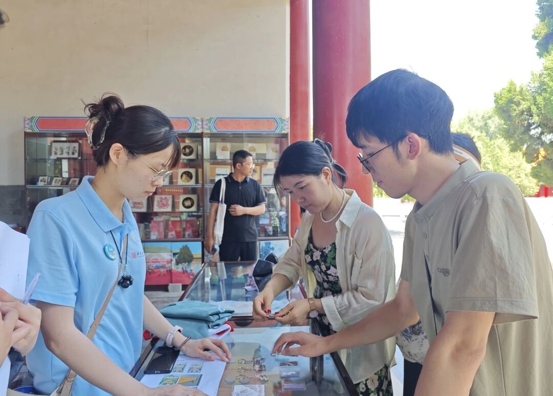 西岳庙文创销售人员对团队设计的西岳庙文创产品给予肯定与建议。他们提到,目前团队设计的几款融入碑刻拓片元素的冰箱贴、古建筑脊兽钥匙扣、赑屃形象驱蚊贴等皆兼具辨识度和实用性,这种结合西岳庙核心文化符号的设计方向是可行的。同时他们也建议,后续可以深化产品并与特色活动相结合,开发限定款文创,既贴合游客体验需求,也能更广泛地传递西岳庙的传统文化。