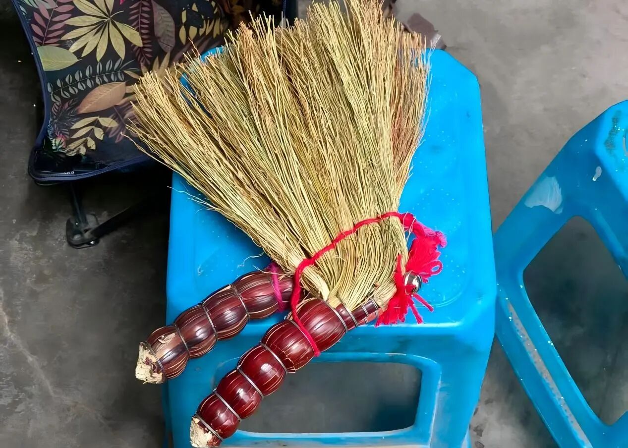离开徐老先生家,队员们又来到村南头扎扫帚的老院。72岁的徐三勤大爷正坐在院里的石墙边,手里的高粱秆在铁丝的缠绕下渐渐成型,随后加上泡过的红色高粱秆皮,是韩城红把扫帚的标志。徐大爷的手指粗糙却灵活,捆扎的力道均匀得像用尺子量过,“红把有讲究,红色是‘红火’,高粱秆是‘节节高’,结婚时扫新房,是盼着日子干净兴旺;老人过世时用,是祈愿一路走好。”徐大爷拿起一把刚扎好的扫帚示范道:“看这力道,得扎得紧实,用上三五年都不带松的。”院墙边整齐地码放着几十把扎好的扫帚,在阳光下泛着温暖的红光,仿佛在诉说着这门老手艺的岁月故事。