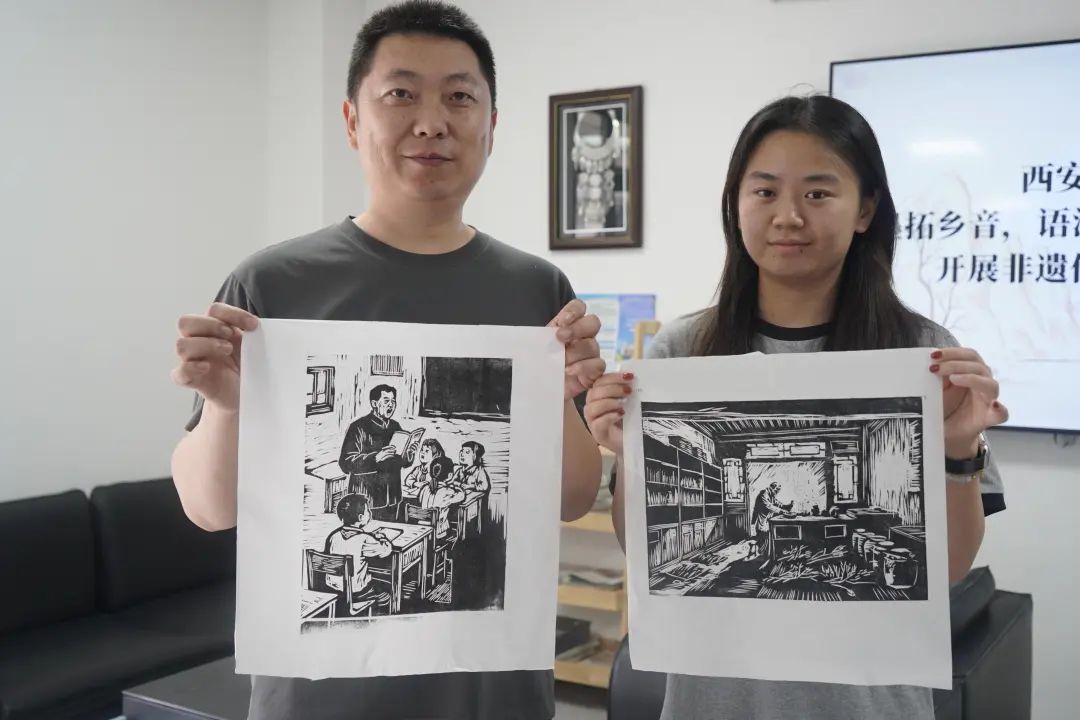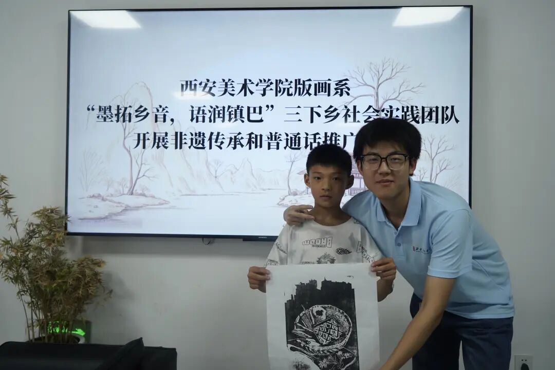 为深入贯彻国家语言文字工作决策部署,大力弘扬中华优秀传统文化,铸牢中华民族共同体意识,西安美术学院版画系“墨拓乡音,语润镇巴”三下乡推普实践团队成员结合青水镇苗族文化和普通话推广,创作版画和水彩作品30余幅,与青水镇政府共同举办了“言艺两相宜,文明润乡里"主题活动推广暨传统版画印制体验活动。