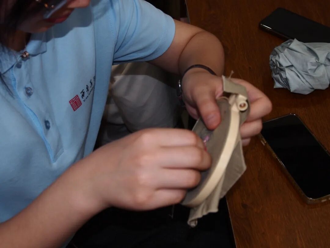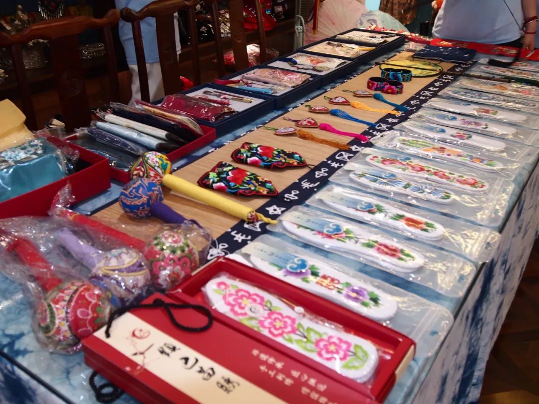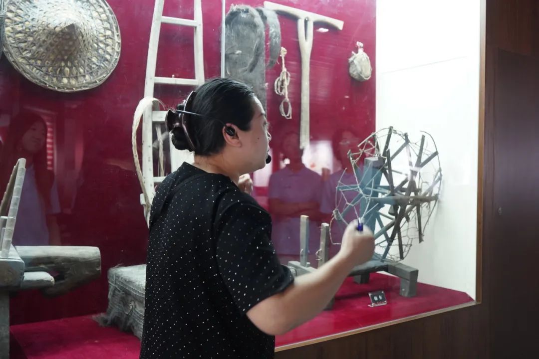 我们还参观了苗族非遗文化工坊,重点考察并学习了苗族刺绣和苗族服饰。现场观摩了非遗传承人进行刺绣创作的过程,了解了刺绣的传统针法、图案寓意及文化内涵;同时也对苗族服饰的款式特点、银饰工艺等进行了学习。期间,我们注意到传承人在介绍非遗刺绣产品时,因习惯使用方言或普通话表述不够标准,存在部分用词模糊、术语不准确的情况,可能影响对非遗文化的精准理解。为此,我们用普通话与传承人深入交流,在请教技艺细节的过程中,结合他们的讲解,针对性地协助规范了产品介绍中的普通话用词,以及表述偏差,既加深了对非遗文化独特魅力与传承活力的感受,也为其更好地对外传播非遗技艺提供了语言上的支持。