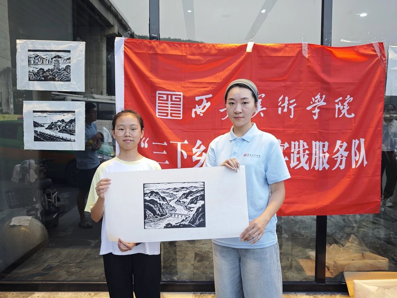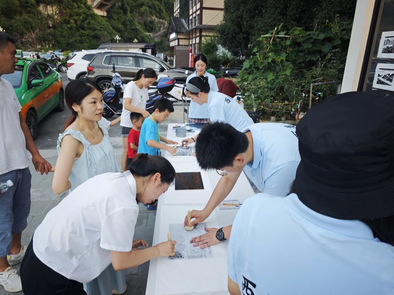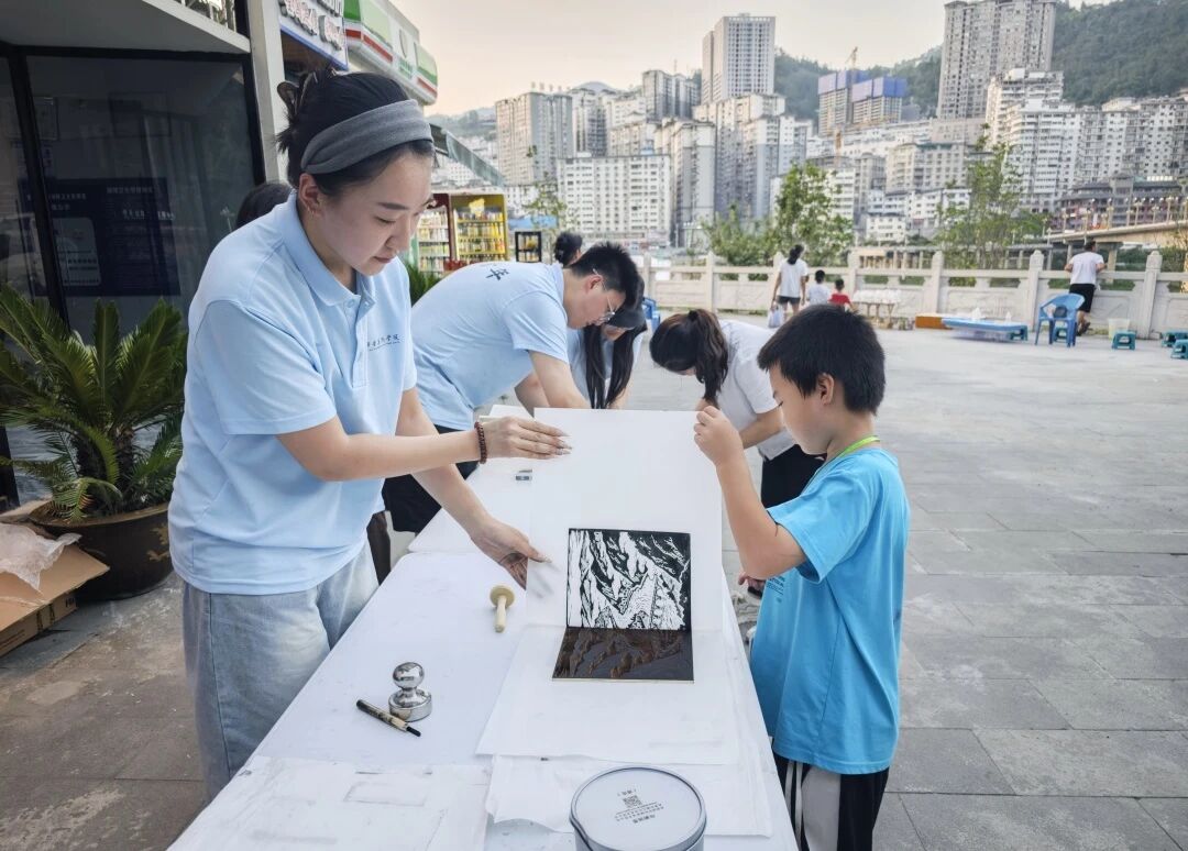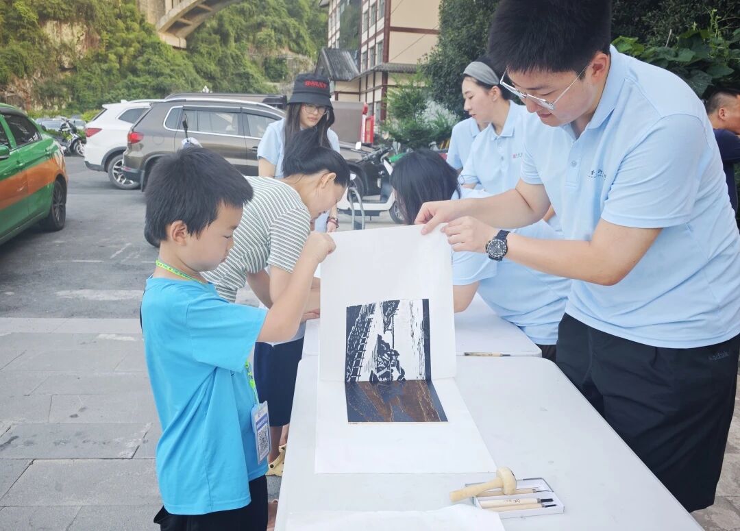 团队近日先后在酒店的工作中心、茶马古道景区服务中心,文笔山下广场开展版画教学与印制体验活动。以版画为媒,搭建艺术桥梁,让美育在乡村落地,为乡村文化添彩。