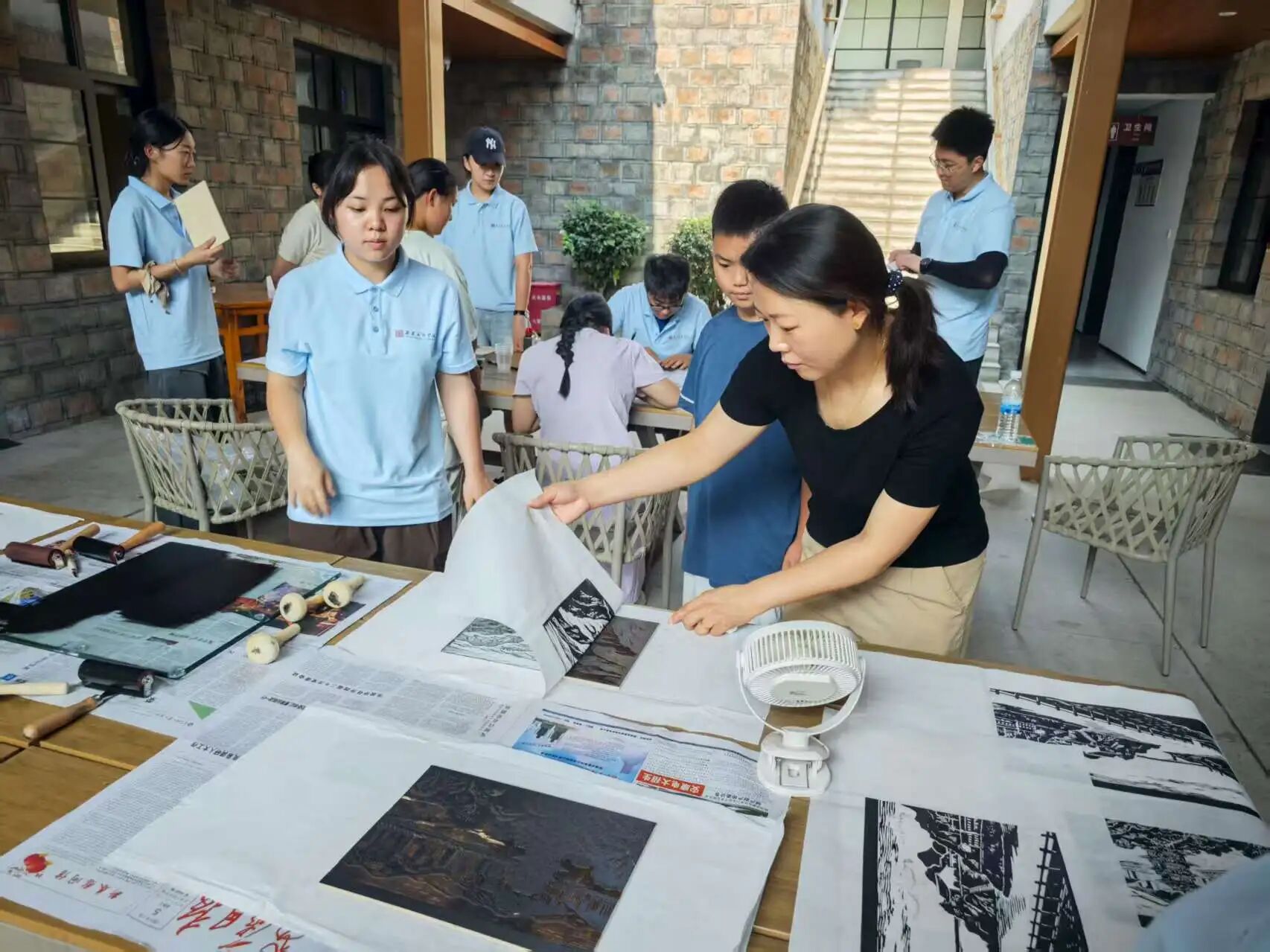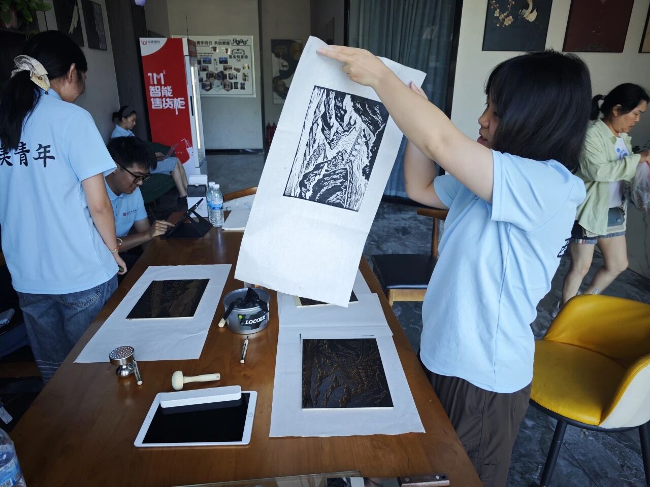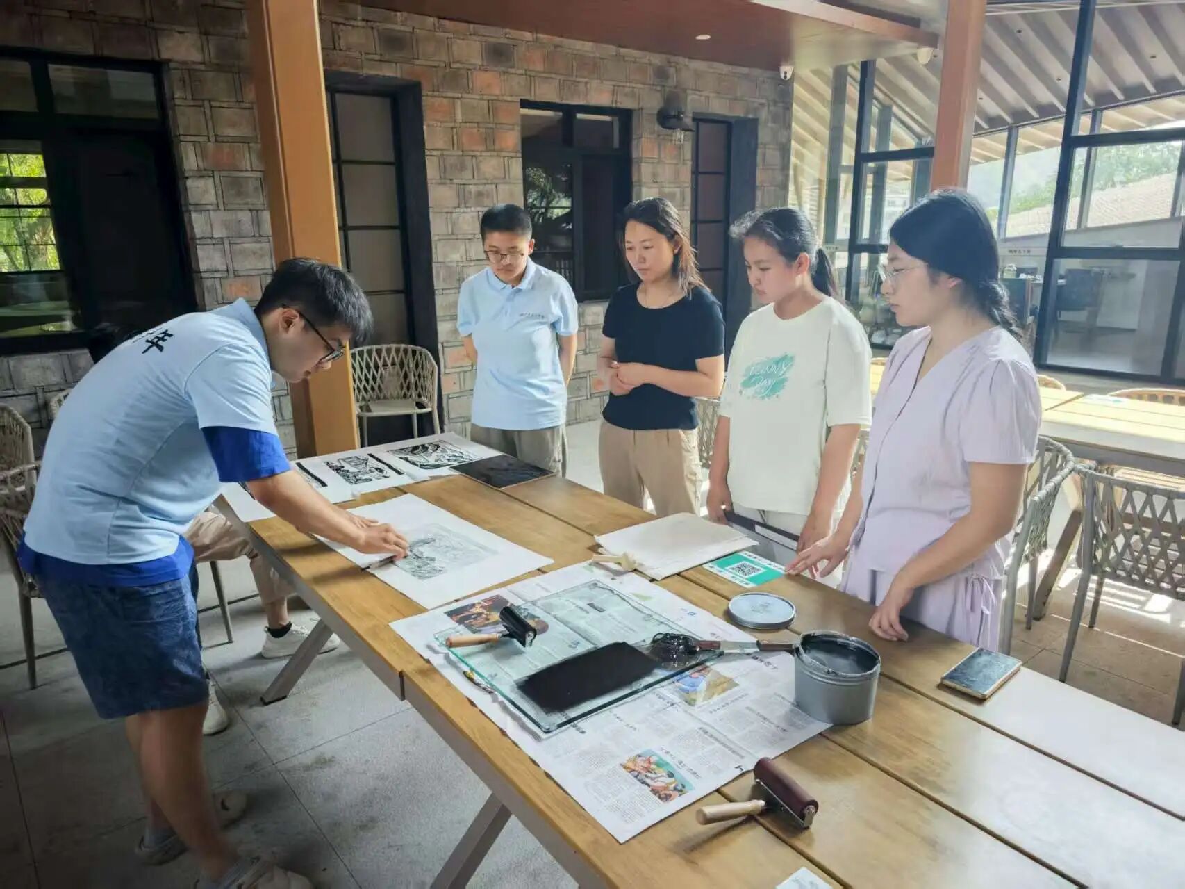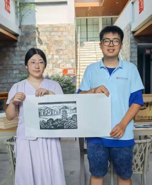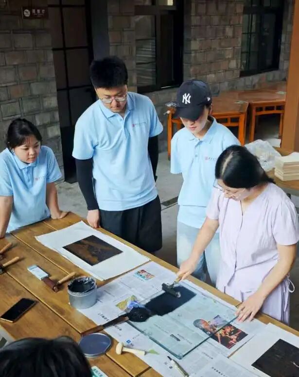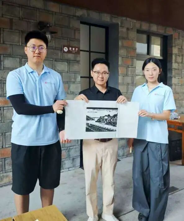 7月14日,团队成员于酒店搭建起版画艺术交流平台。成员们以专业且严谨的态度展示版画印制流程,精准上墨、均匀印制,将艺术创作过程完整呈现,为乡村文化传播与美育普及提供生动实践范例。