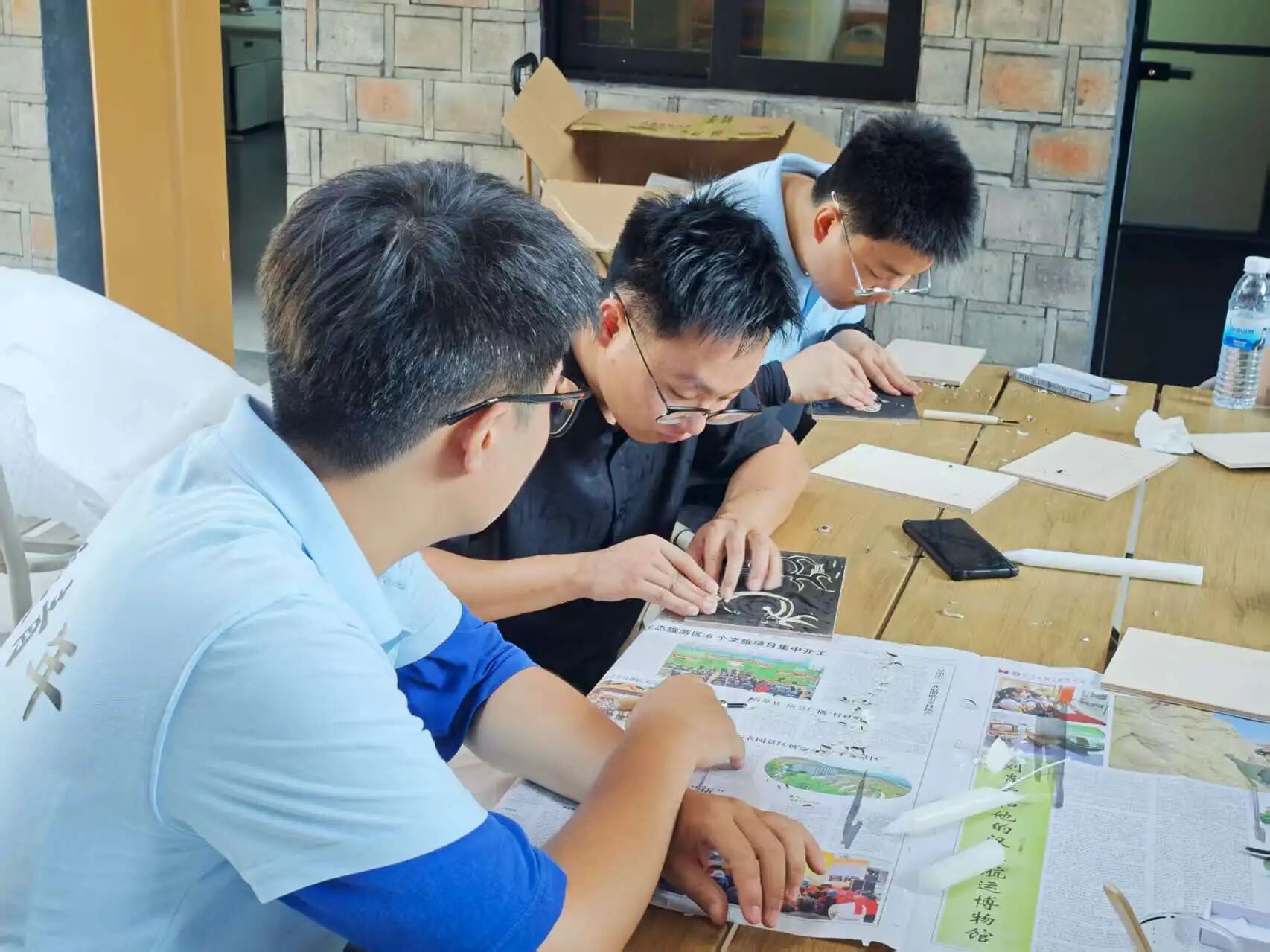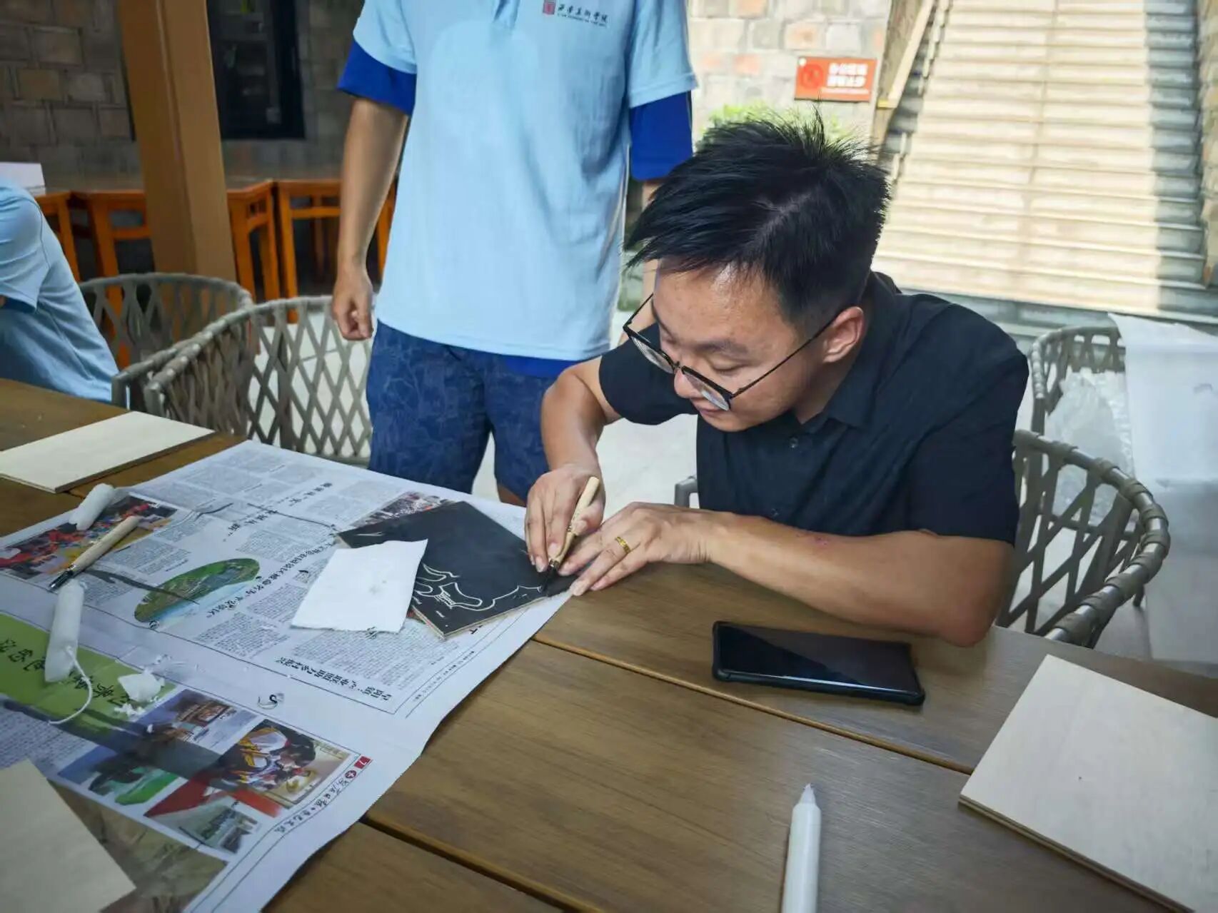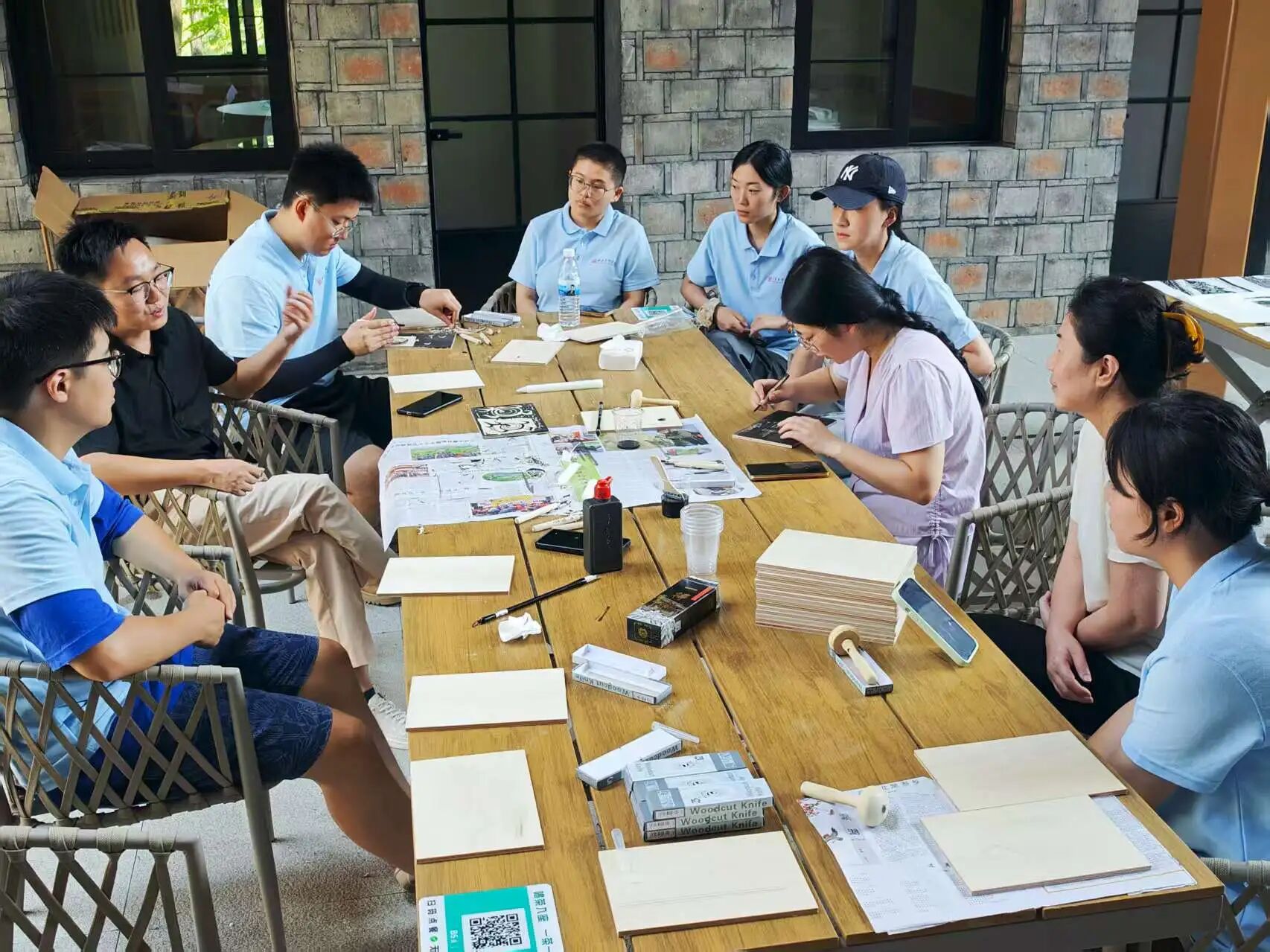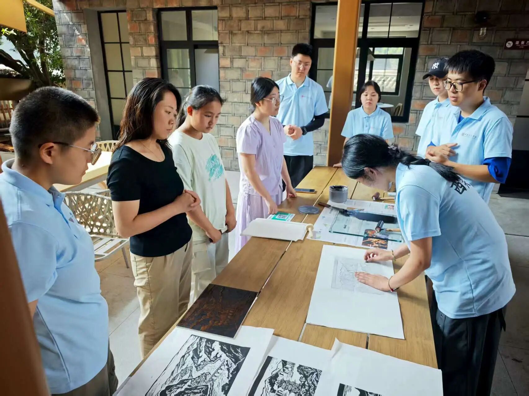 7月14日,团队成员于酒店搭建起版画艺术交流平台。成员们以专业且严谨的态度展示版画印制流程,精准上墨、均匀印制,将艺术创作过程完整呈现,为乡村文化传播与美育普及提供生动实践范例。