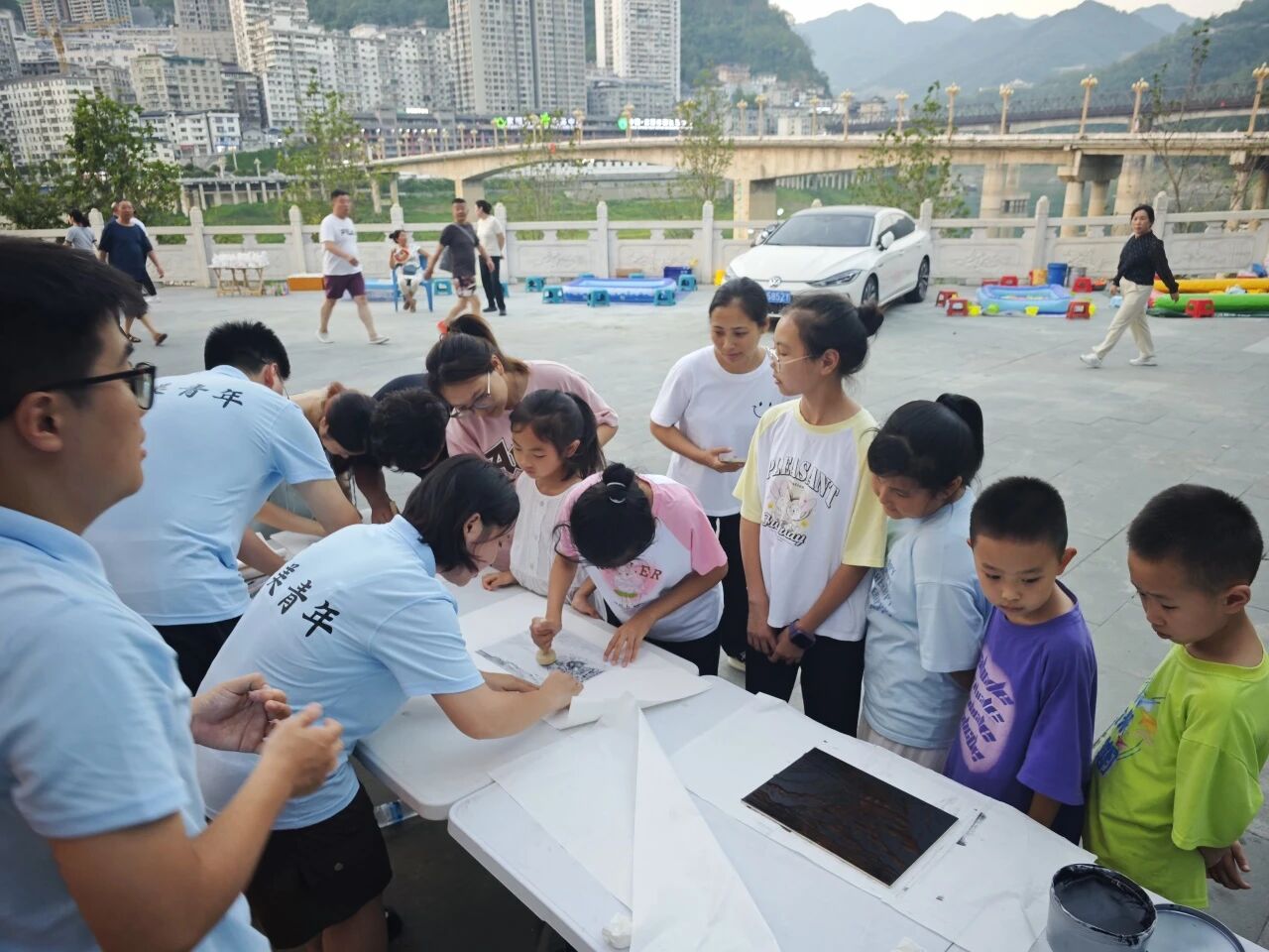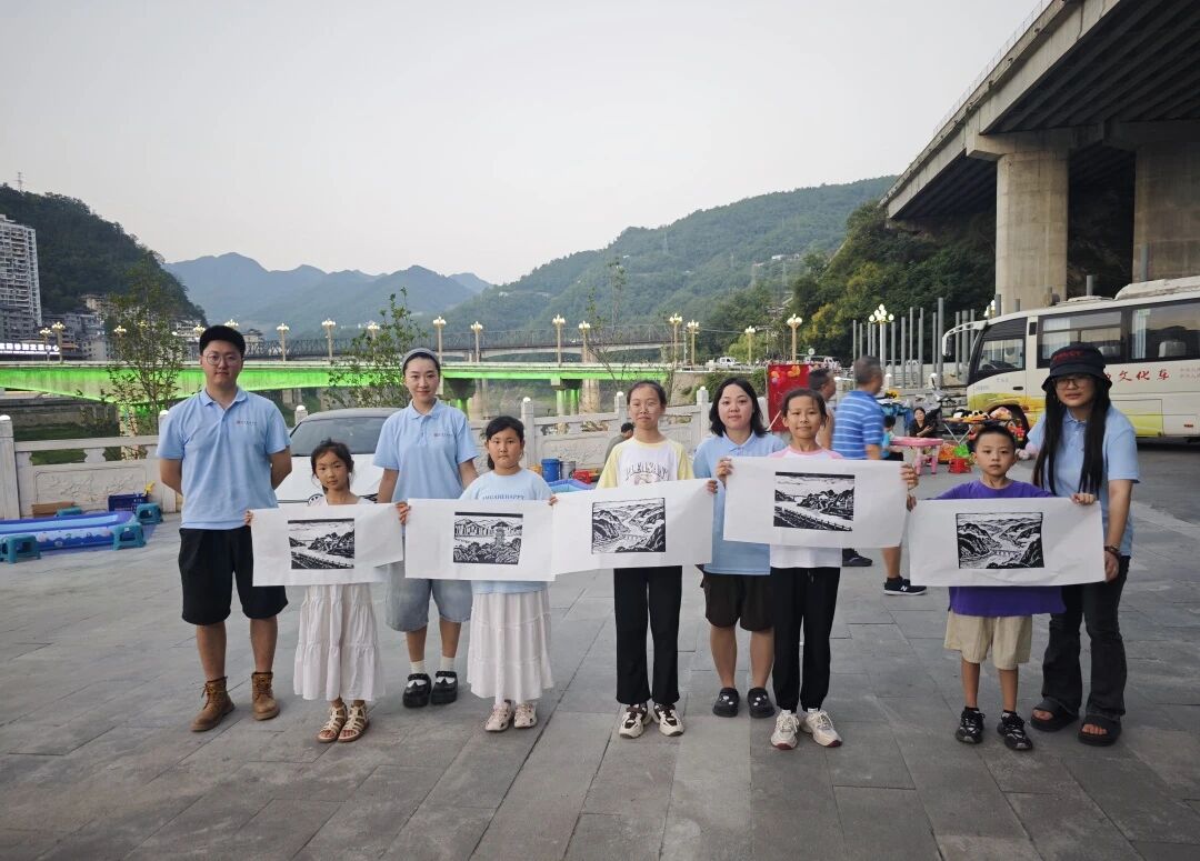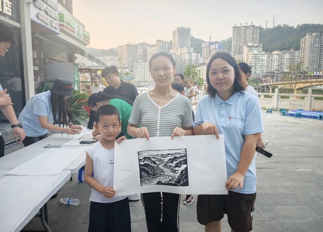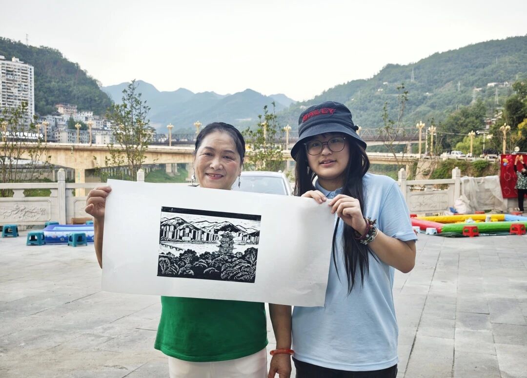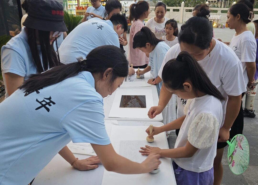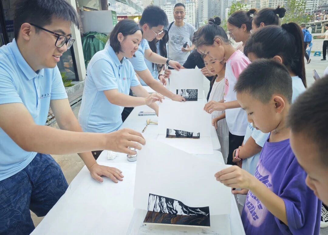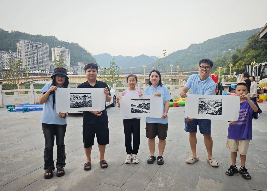 活动现场,众多儿童积极参与,路人游客也被吸引驻足。同时,作品原版融入紫阳地标建筑元素,以版画为媒介进行创作与宣传。