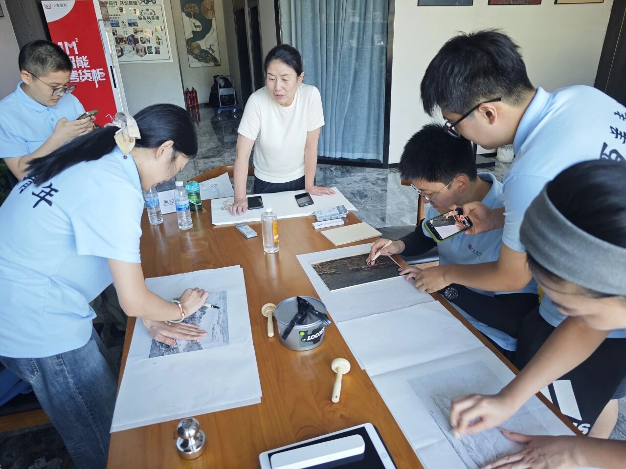 活动中,成员们凭借扎实的专业知识与丰富的实践经验,以严谨的治学态度,向景区老师详细讲解版画技法,涵盖刀法运用、线条表现等关键要点,并亲自示范印制方法,从调墨、上版到拓印,每个步骤都精准把控。