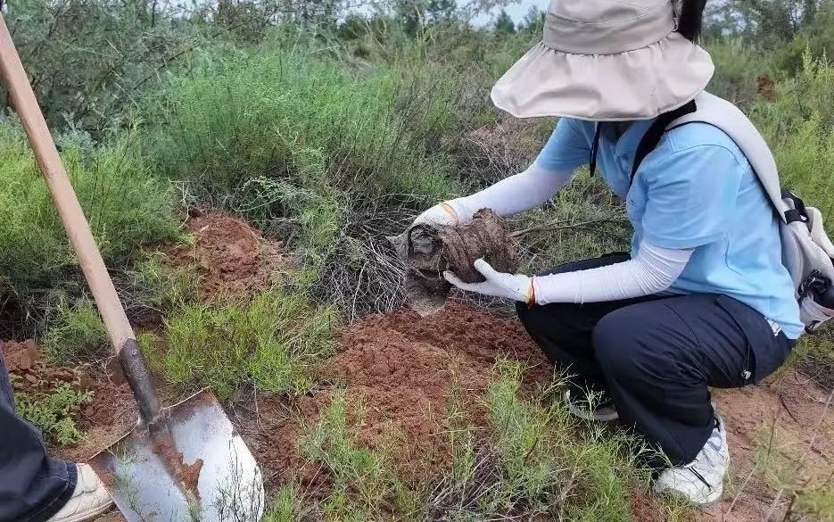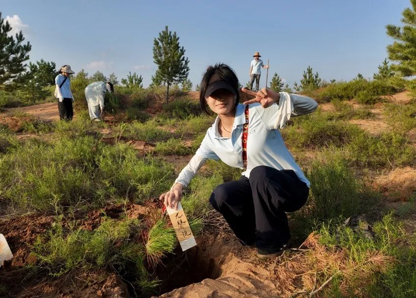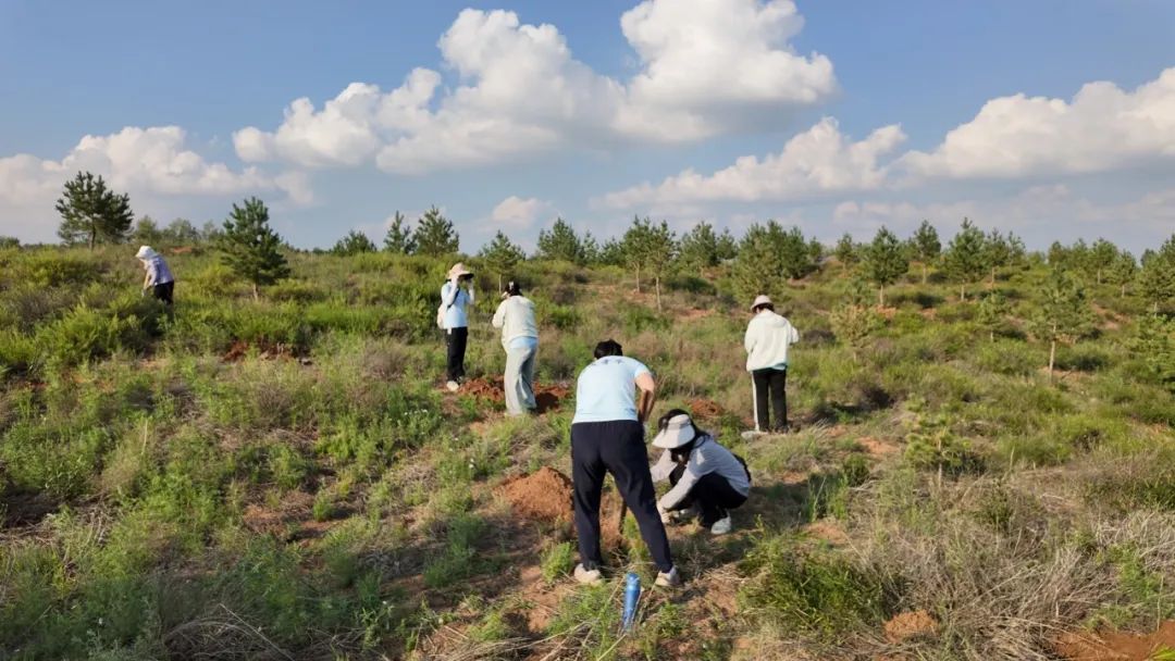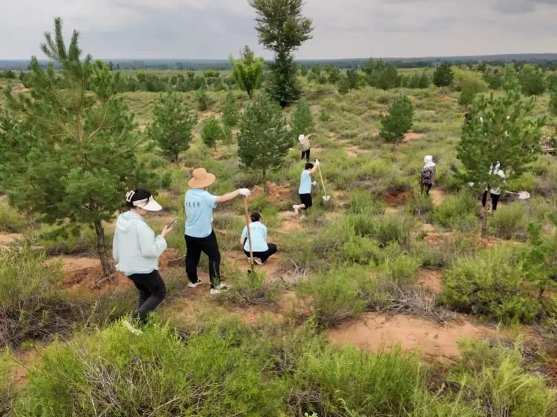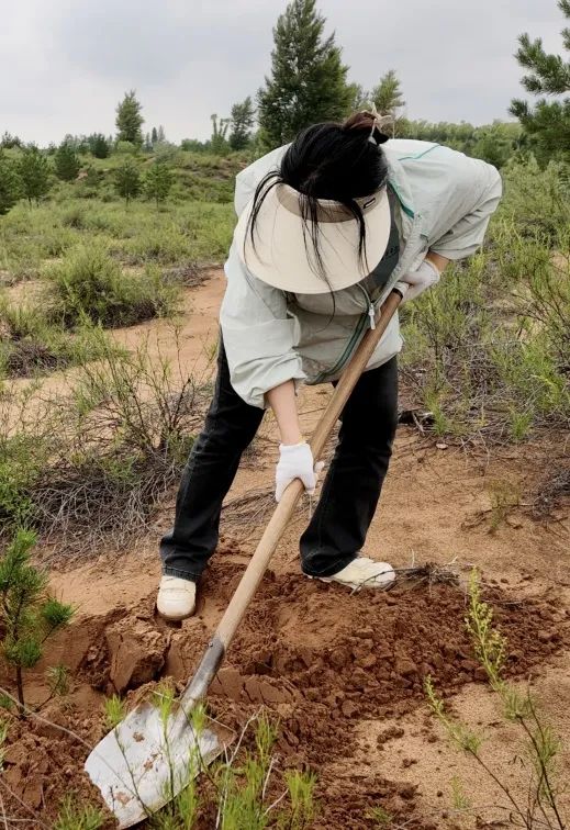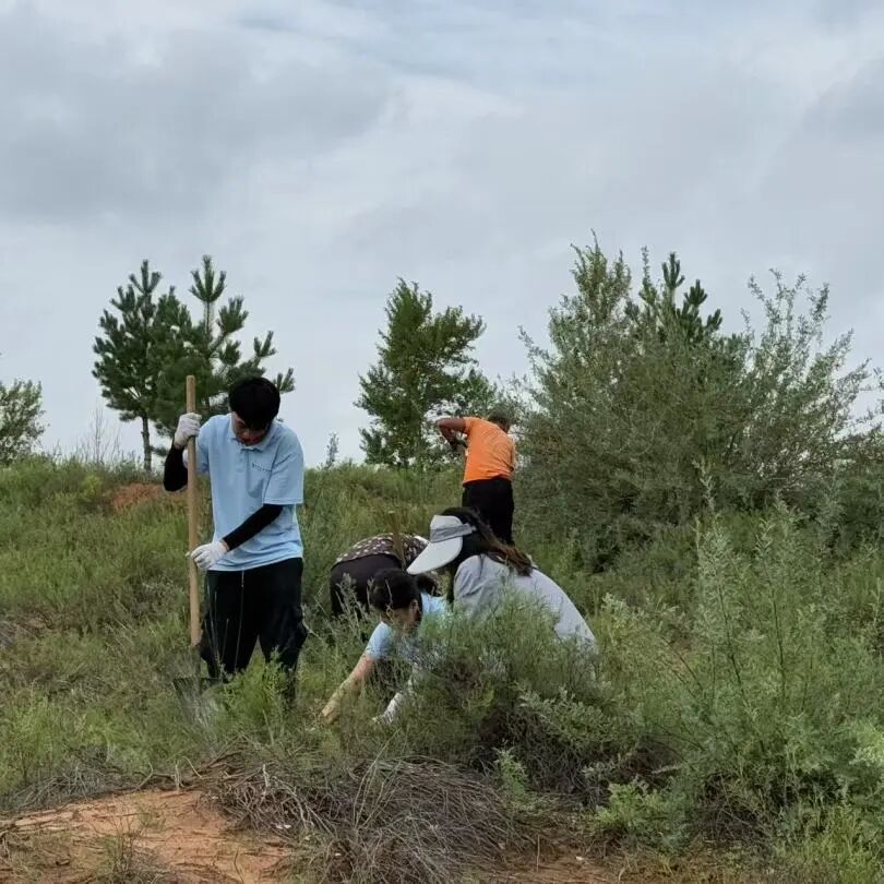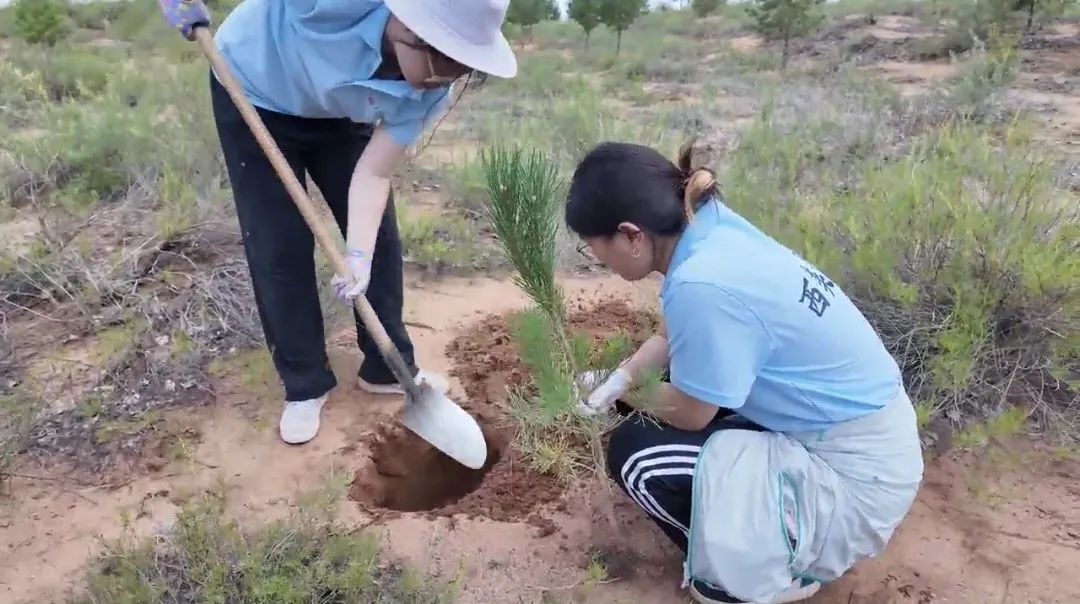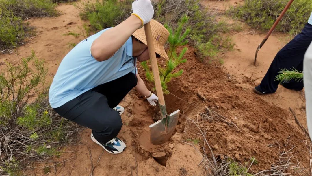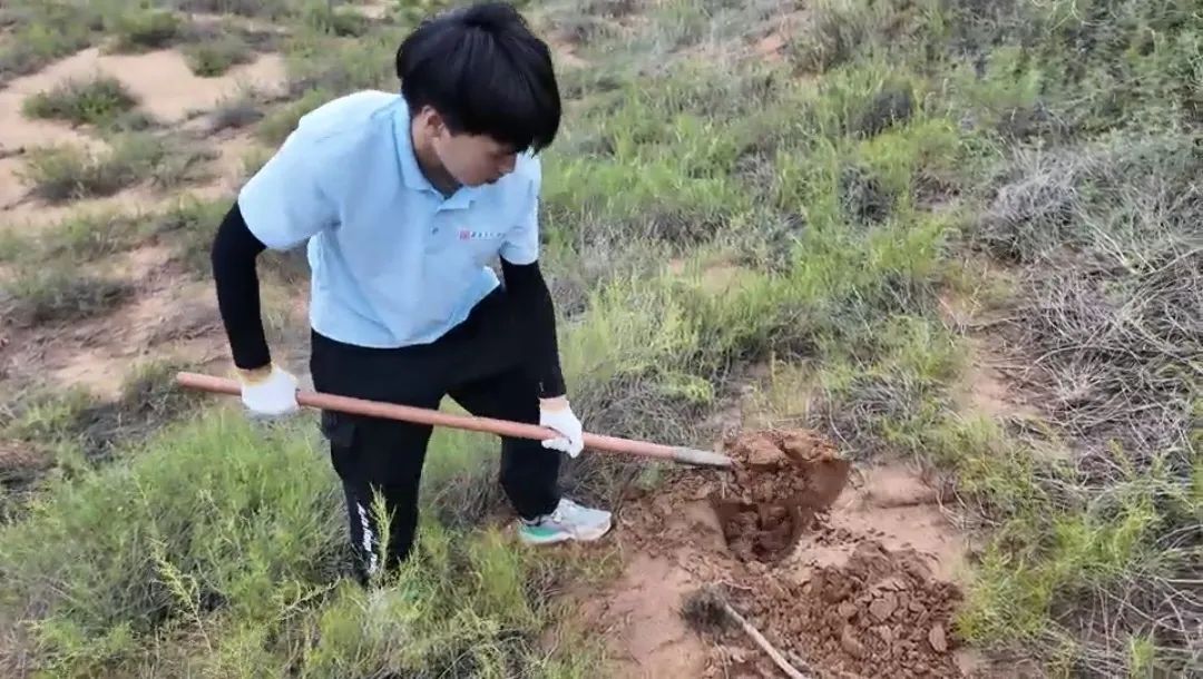 理论学习结束,成员们戴上手套、扛起铁锹,化身“治沙新兵”,迫不及待地拿起工具,投入到植树实践中。在划定的植树区域,大家分工协作,干劲十足。