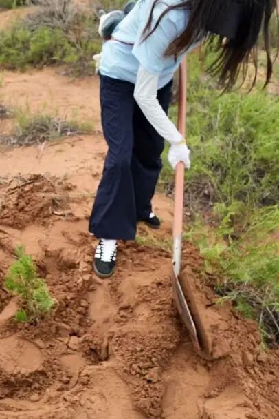 挖坑是植树的第一步,也是关键一步。由于沙漠土壤疏松且干燥,挖坑比在普通土地上更为艰难,但这丝毫没有减退大家的热情。经过成员们的努力,一个个标准的树坑整齐排列。
