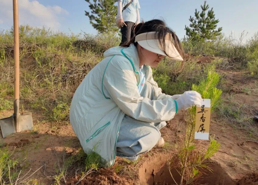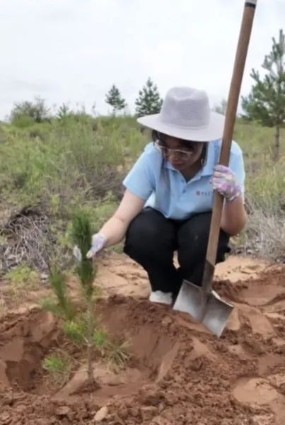 随后,队员们小心翼翼地将树苗放入坑中,扶正、填土、踩实,每一个动作都饱含着对生命的呵护与对绿色的期待。为确保树苗直立,反复调整位置;为维系根茎舒展,仔细剔除石块。在成员们的齐心协力下,一棵棵树苗稳稳扎根在沙漠之中,为这片荒芜的土地增添了一抹新绿。