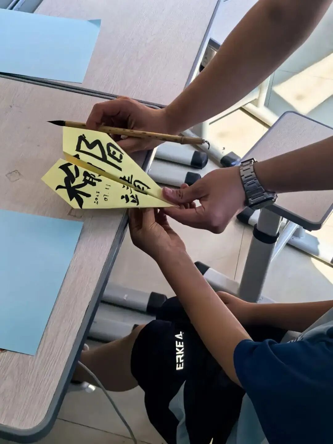 在折纸活动环节,队员们为孩子们准备了色彩鲜艳的卡纸,并用毛笔在卡纸上写下“美丽中国”“中考必胜”“梦想成真”等祝福语,笔墨间的温度与力量让卡纸变得格外有意义。