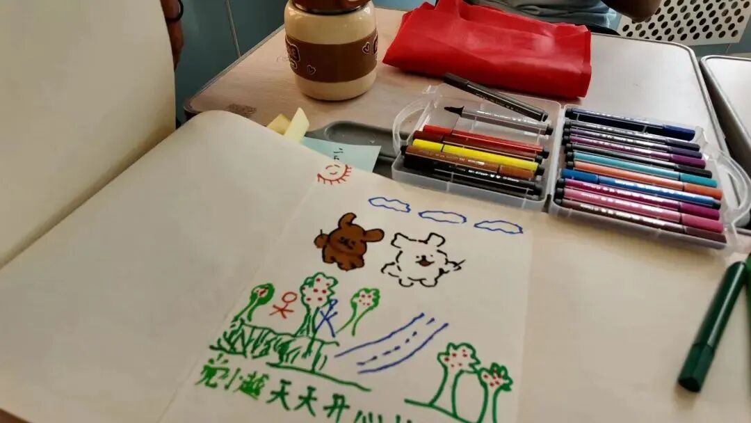 此次的美育活动,团队成员还带来了精心准备的空白册页,邀请孩子们将今天折纸的得意作品或心中喜爱的图案绘制在册页上。有的孩子画出了刚才折的五角星,有的描绘毛乌素沙漠的树苗,有的描绘了心中的蓝天白云,还有的用稚嫩的笔触写下了自己的名字……孩子们的创作虽简单却充满真诚,当所有作品汇聚成册,一幅由童心、创意与爱意共同组成的“大作”跃然纸上,成为此次活动最珍贵的纪念。团队成员们也在册页上用毛笔留下属于自己的签名。