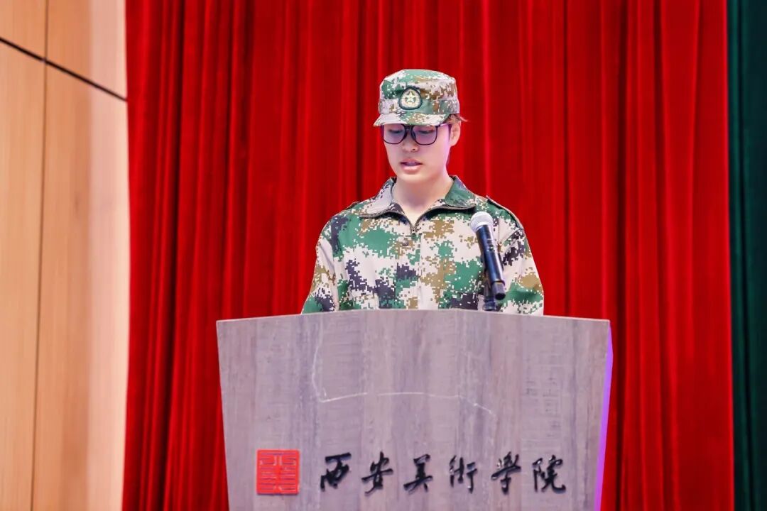 丁巨涛代表学院感谢解放军陆军边海防学院对西安美术学院军训工作的大力支持,向解放军陆军边海防学院赠送纪念锦旗,军训团团长景熠阳接旗。