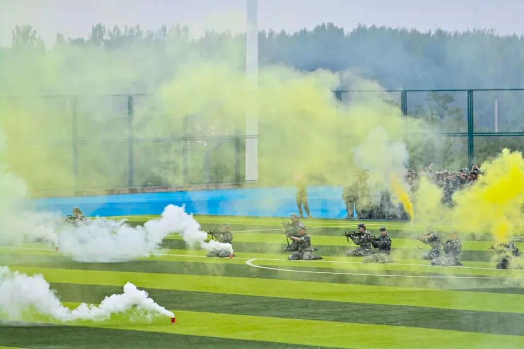 随后,军事科目表演轮番上演。匕首操表演者手握器刃变换队形,转体刺、侧刺、反刺利落迅猛,寒光流转间展现实战技巧与无畏气。军体拳方阵中,数百名新生动作整齐, “ 哈!哈!”呐喊震彻操场,冲拳、踢腿、格挡衔接流畅,尽显军人气魄。紧接着,刺杀操表演将气氛推向顶点 ,新生手持模拟装备, “ 杀!杀!杀!”的怒吼震人心魄,突刺、防刺、反击动作凌厉,尽显钢铁意志。格斗术环节,擒摔、锁喉、躲闪反击充满力量,传递出新生们敢拼敢闯的态度。