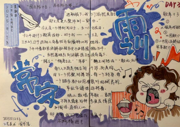 晚间军训学歌时,我的嗓音已沙哑,然而当各连队开始“邀歌”较量时,热烈的气氛竟让我暂时忘却了身体的不适。我们连队的歌声愈发洪亮,我也努力发出虽沙哑却尽力的和声,歌声此起彼伏,我们笑着唱着,白日的疲倦竟不知何时消散了。