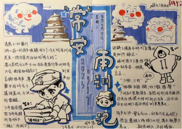 晚风渐凉,拂过下午晒得微热的脸颊,回望操场,今日的疲惫早已被一种滚烫的情绪替代,清晨地库到操场的那段路,没有让我们退缩,反而让我们学会在凛冽中挺直腰杆。午后场馆内外的冷热交替,不仅是温度的变换,更让我们感知到生活里藏着的未知与惊喜。而最难忘的是夜晚会操时与同伴的并肩同行——我们循着同一道口令调整姿态,跟着同一串节奏迈出脚步,眼神里的坚定相互映照,沉默里的默契悄然生长。