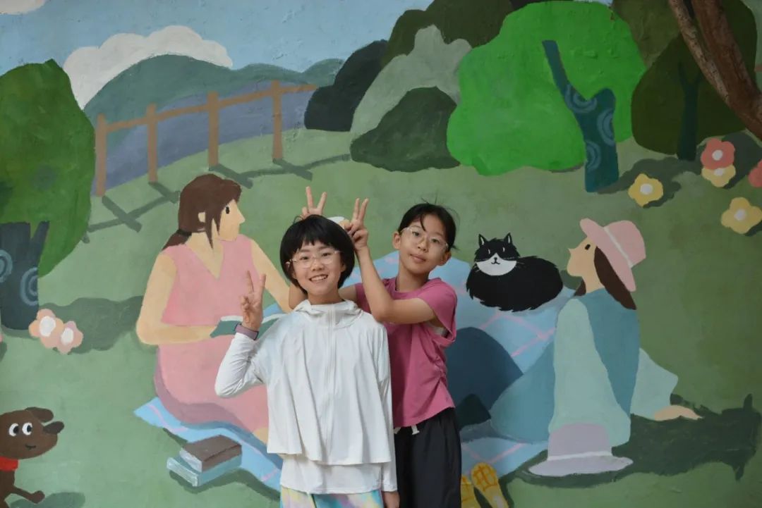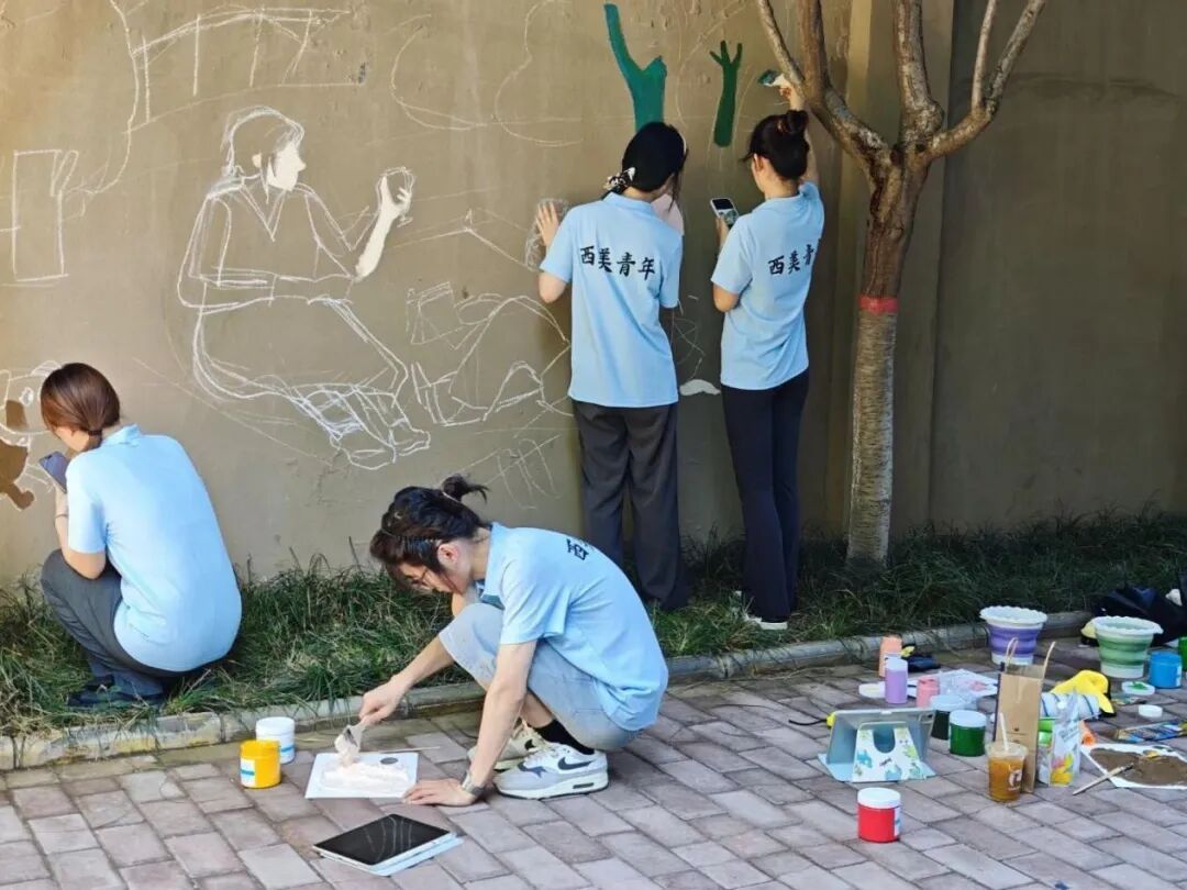 7月5日至9日,服务队正式投入紧张的主题墙绘工作。师生们顶着烈日,分工协作。从线稿定位,到主体绘制、细节深化。队员们运用明快的丙烯色彩和卡通化造型,将预设的