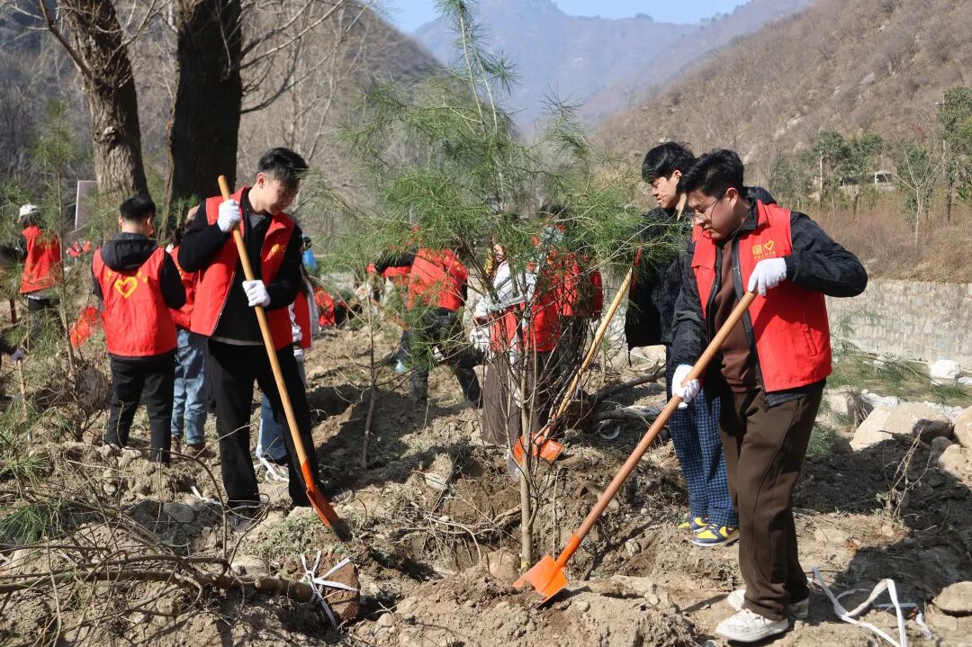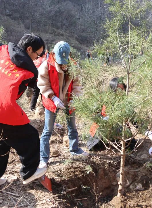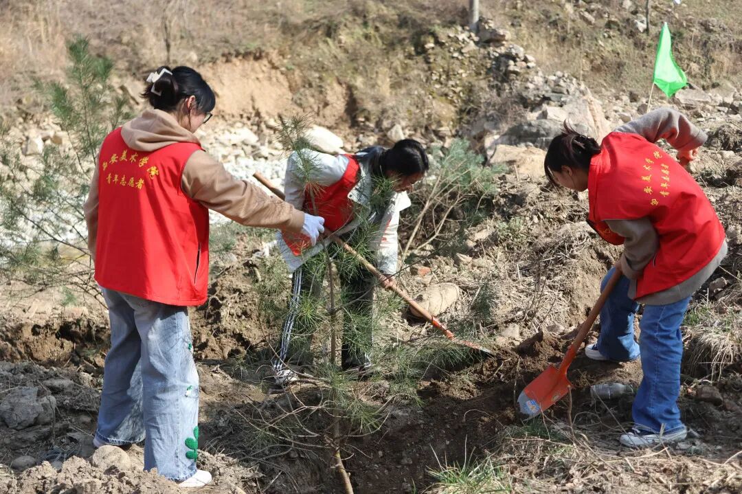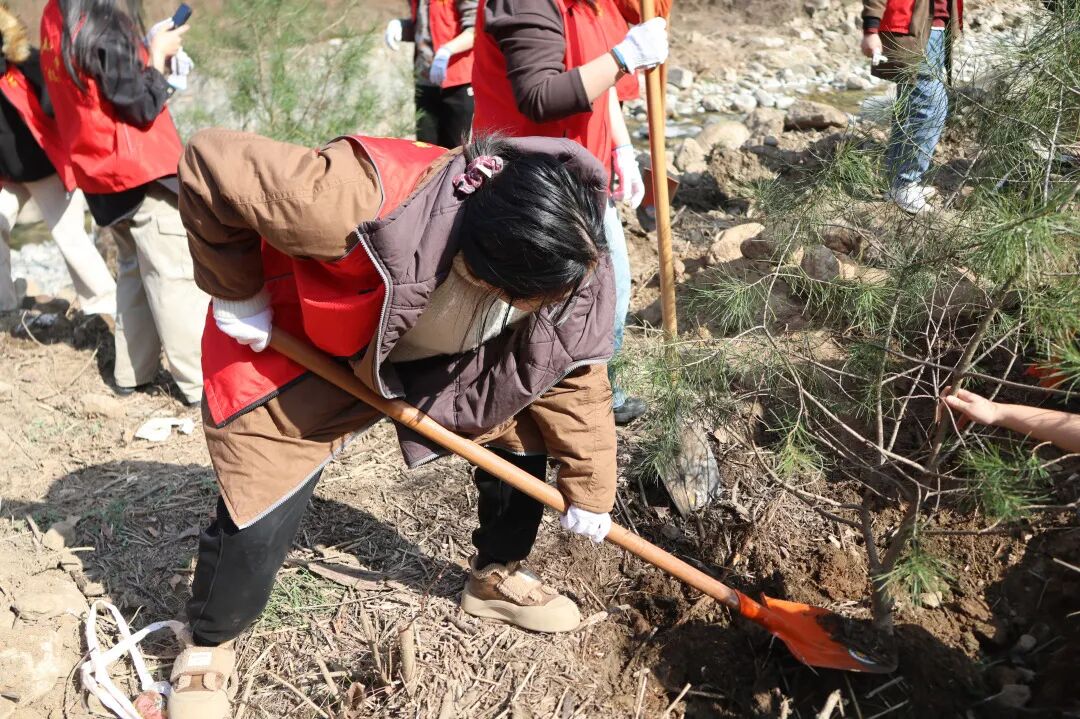 在大家的共同努力下,一株株树苗在春风中扎根沃土、舒展枝叶,错落有致地挺立在山坡上。那一抹抹新生的嫩绿,与志愿红的身影交相辉映,成为春日山间最动人的风景。